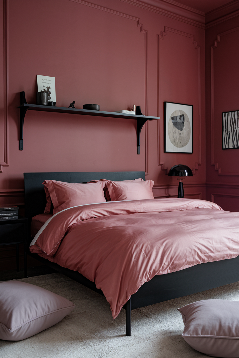 Rose pink, with its deeper hue, creates a more mature and refined atmosphere in the bedroom, especially when paired with striking black accents. The combination of these two colors brings depth and sophistication to the room. Consider using rose pink for your bedding, curtains, or walls, and incorporate black furniture, such as a sleek black bed frame or black accent chairs. To soften the bold contrast, add a few lighter neutral elements, like a white rug or soft grey cushions. This design creates a bold yet balanced look, blending femininity with a touch of modern edginess.