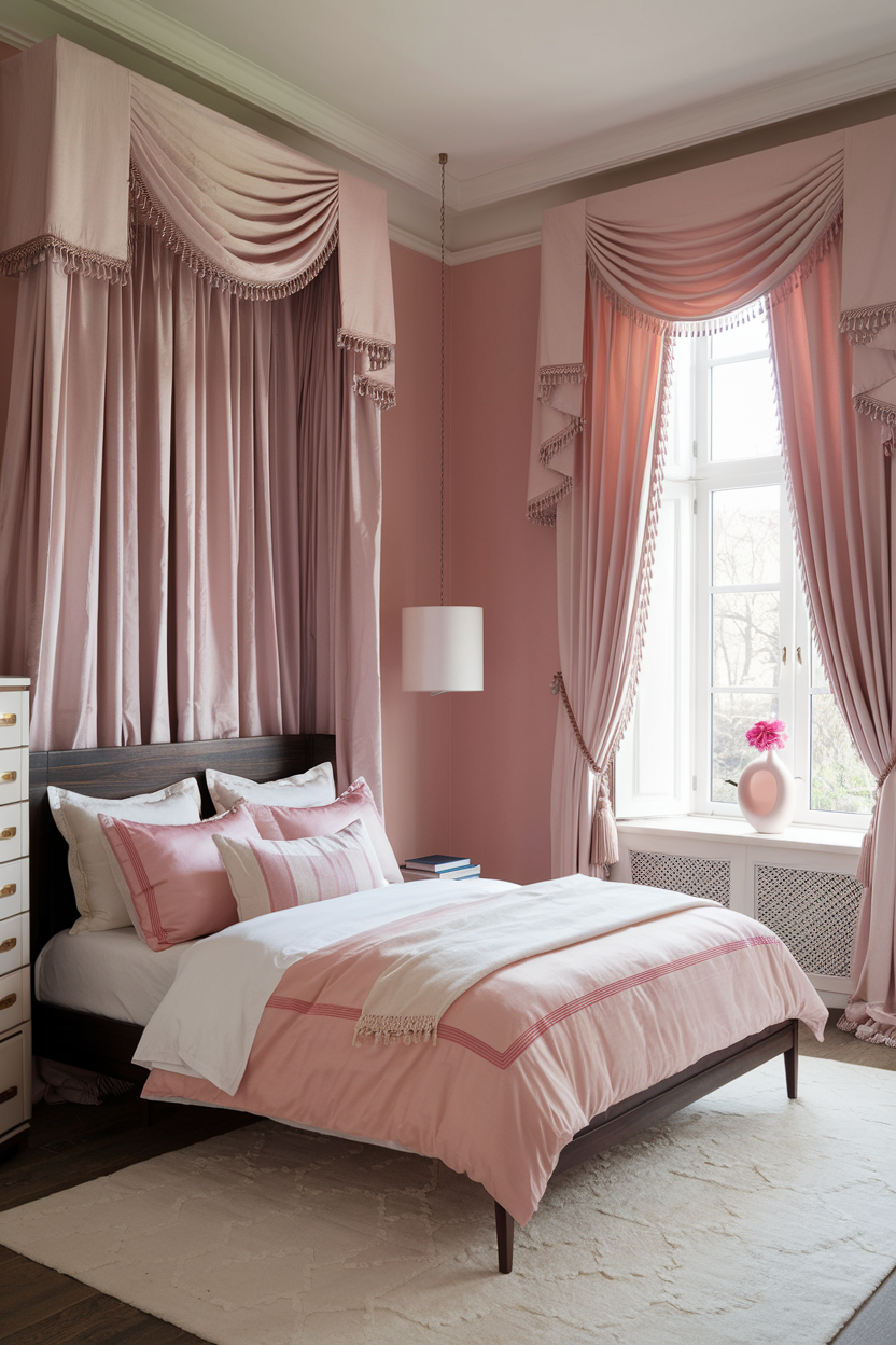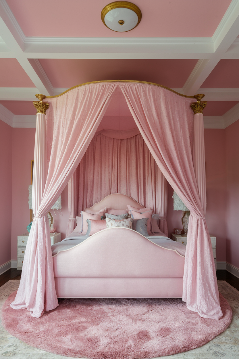 For a truly dreamy and romantic bedroom, consider adding a canopy bed with pink drapery. The soft pink fabric cascades elegantly from the ceiling, creating a sense of grandeur and luxury. Whether you opt for a soft blush or a deeper rose hue, the canopy bed adds an air of sophistication and comfort. Complement the bed with delicate, neutral-toned bedding to ensure the room feels serene. Add gold or brass fixtures for a touch of glamour, and incorporate plush textiles such as velvet cushions and silk sheets to elevate the romantic atmosphere.