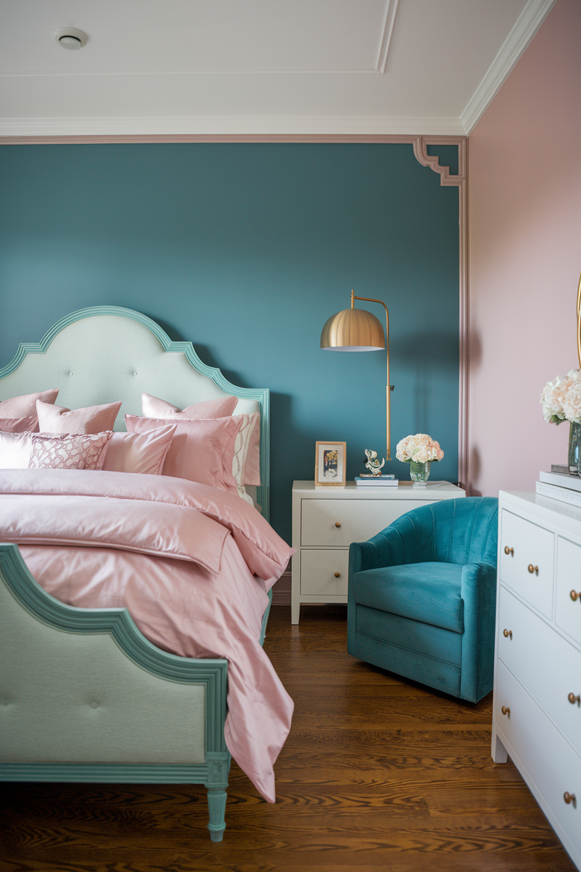 For a bold and sophisticated bedroom, pair dusky pink with a rich teal for a striking contrast that remains elegant. Dusky pink brings a soft, calming element, while teal adds vibrancy and depth. Consider dusky pink bedding or an accent wall, paired with a teal bed frame or decorative throw pillows. The deep teal tones ground the lightness of the pink, creating a balanced and stylish space. This combination can be further elevated with metallic accents, such as a gold lamp or brass bed frame, for a touch of sophistication and warmth.