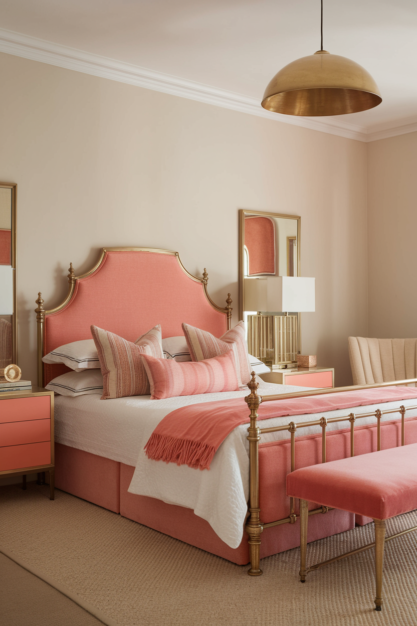 Coral pink brings warmth and vibrancy to a room, and when paired with brass accents, it creates an elegant and modern bedroom design. Coral pink can be used in bedding, accent pillows, or even a feature wall, and brass can be incorporated through light fixtures, mirrors, and furniture hardware. The contrast between the warm, inviting coral and the cool, metallic brass creates a refined and luxurious atmosphere. Consider using soft, neutral furniture to balance the boldness of the coral and brass, such as a beige or taupe bed frame and side tables. This combination creates a chic and sophisticated bedroom that feels both inviting and upscale.