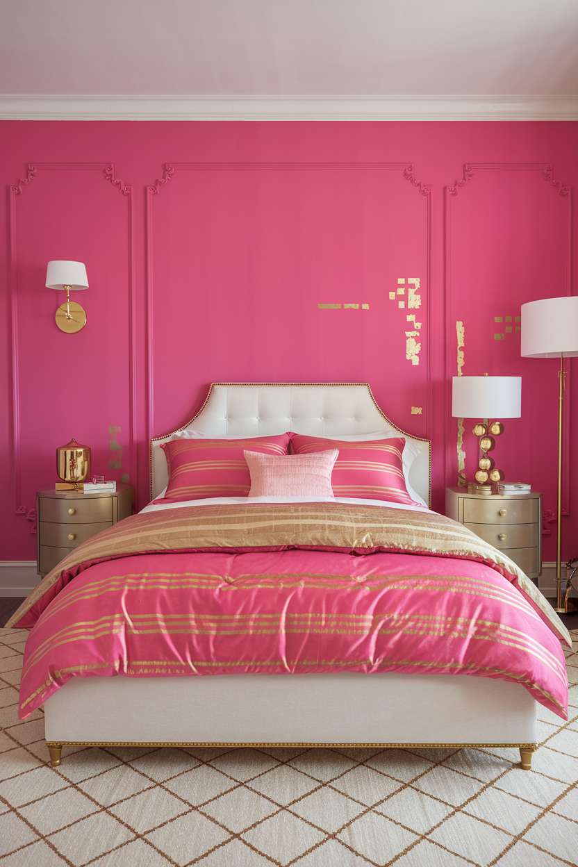 If you want a bedroom that stands out while maintaining sophistication, consider using hot pink as an accent color combined with luxurious textiles. A hot pink feature wall can serve as a statement piece in your room, while plush fabrics such as velvet or satin bedding can add texture and elegance. To balance the boldness of hot pink, choose neutral-colored furniture like a simple white bed frame and soft grey nightstands. Incorporating metallic elements in gold or silver can further elevate the luxurious feel of the space, making it both glamorous and comfortable.