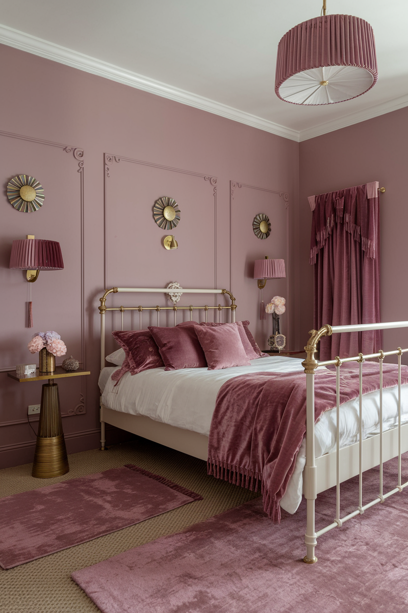Mauve pink, with its soft, muted tones, can create a calm and sophisticated atmosphere in your bedroom. When paired with brass details, such as brass light fixtures, mirror frames, or bed frames, mauve becomes even more refined and elegant. Consider using mauve for your walls or bedding, and complement this with brass accessories that add warmth and luxury. To complete the look, incorporate plush textiles such as velvet or silk cushions, and add an oversized brass floor lamp for a statement piece that ties everything together.