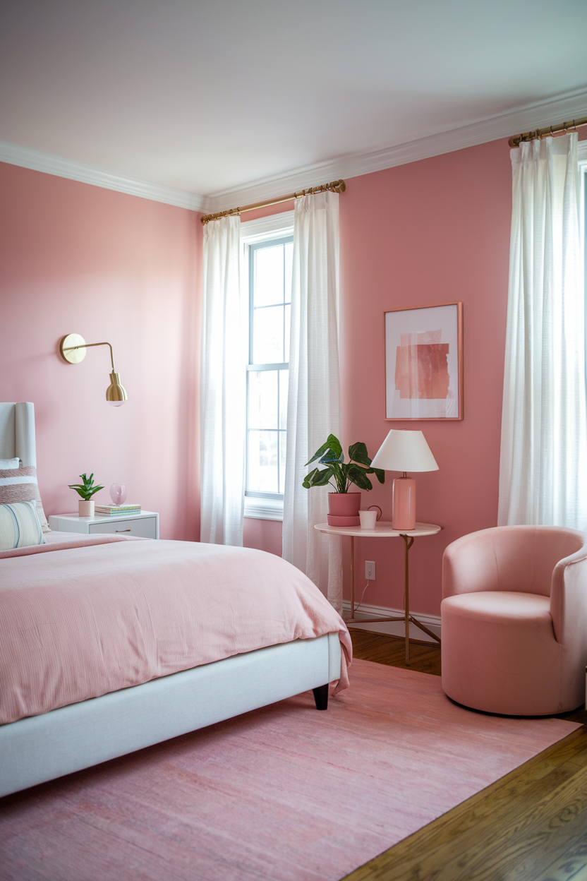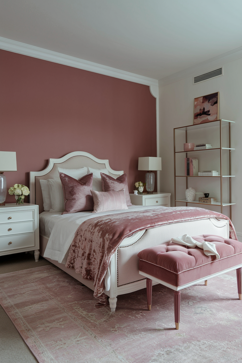 Dusty rose, with its muted pink tones, is perfect for creating a sophisticated and elegant bedroom. Paired with white, it exudes a timeless, refined feel. A dusty rose accent wall can serve as the focal point of the room, while white furniture such as a sleek bed frame, bedside tables, and shelving adds crisp contrast. Incorporating soft textures like plush throw blankets, velvet cushions, and a luxurious area rug in shades of pink or ivory creates a cozy yet stylish space. This pairing is ideal for those who want to embrace pink in a subtle yet sophisticated way while maintaining a serene and uncluttered environment.