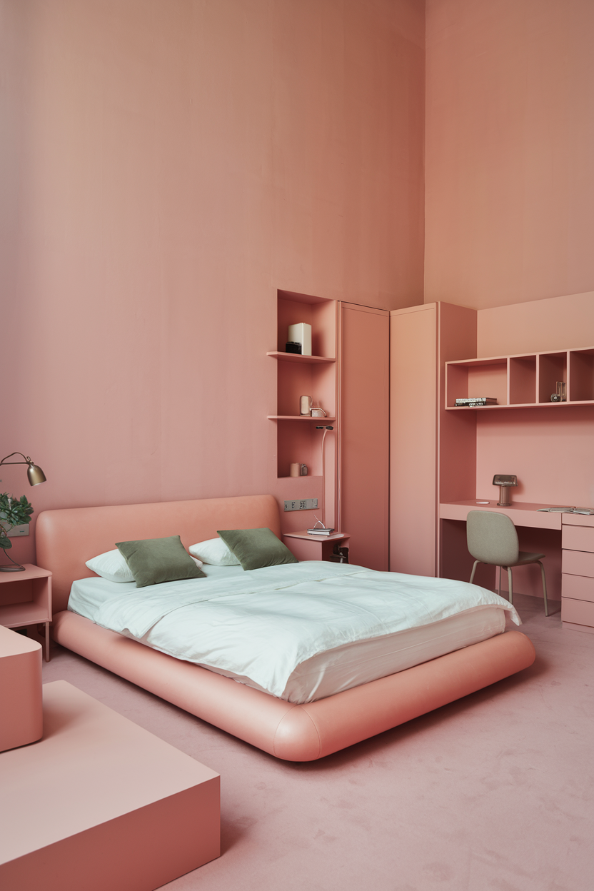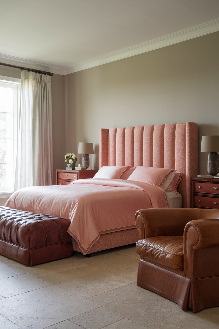 Salmon pink, a deeper yet warm shade of pink, brings an element of boldness and comfort to the bedroom. When combined with rich leather accents, it creates a bedroom that is both luxurious and contemporary. Consider a salmon pink duvet cover or an upholstered headboard, paired with leather nightstands or a leather armchair. The leather adds texture and sophistication, while salmon pink brings warmth and vibrancy. For a balanced design, incorporate neutral shades of beige or grey for the flooring or other furniture pieces, making the pink and leather accents pop in the room. This combination is perfect for a high-end bedroom with an inviting and chic atmosphere.