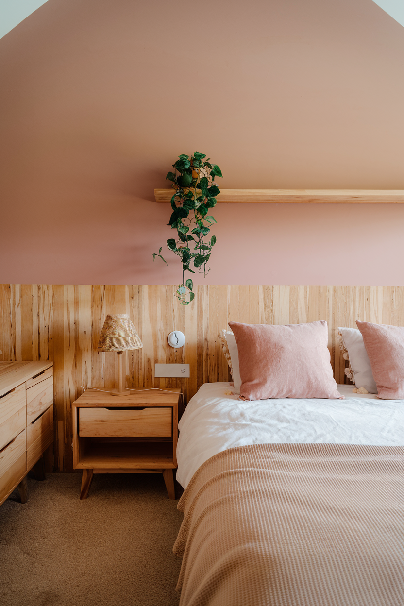 Blush pink is a soft, subtle tone that works beautifully when paired with the natural warmth of wood elements. The soft pink adds a gentle touch of femininity, while natural wood furniture and decor pieces bring a grounded, organic feel to the room. A blush pink accent wall can set the tone, while natural wood furniture, such as a bed frame, nightstands, and shelving, helps balance the softness of the color. Consider incorporating wooden elements like a rattan chair or woven baskets for extra texture. This pairing creates a tranquil and earthy space that feels both cozy and sophisticated, making it perfect for a retreat-like atmosphere.