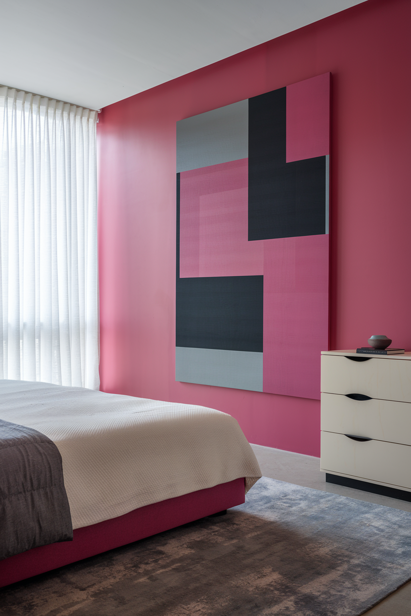 Fuchsia pink is a bold, vibrant color that can bring energy and excitement into your bedroom. When combined with modern art pieces, it creates a dynamic and youthful atmosphere. Start by painting an accent wall or incorporating fuchsia pink bedding or cushions. Add modern abstract art or geometric prints that incorporate fuchsia tones to keep the room feeling fresh and contemporary. To balance the intensity of the color, choose minimalist furniture in neutral tones like white, black, or grey. The art acts as a focal point, and the fuchsia pink serves as a statement color that injects personality into the room without overwhelming it.