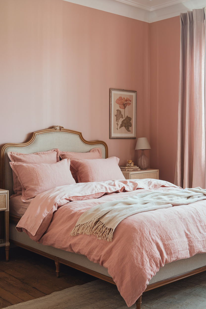 Peachy pink, a warm and slightly muted shade, can create a cozy, inviting bedroom that feels both fresh and comforting. Combine this color with soft linen textiles to enhance the room’s relaxed, laid-back vibe. Peachy pink can be used in the bedding, curtains, or as an accent wall, while linen fabric offers natural texture and an airy feel. Linen sheets, throw pillows, and a linen-upholstered bed frame can complete the look, creating a soft, textured environment. To further elevate the space, consider adding vintage-inspired furniture in wood tones or soft gold accents for a touch of understated elegance.