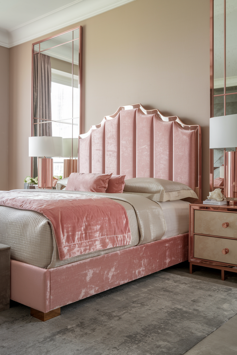 For a bedroom design that exudes luxury and sophistication, pair pink velvet with rose gold accents. Velvet’s rich texture enhances the opulence of the room, while rose gold brings in a metallic element that adds warmth and glamour. Consider a pink velvet headboard, throw pillows, or bedding, complemented by rose gold lamps, mirrors, or a rose gold-framed bed. The velvet fabric creates a soft, tactile experience, and the rose gold details elevate the overall aesthetic, making the room feel like a high-end retreat. To complete the design, opt for a neutral color palette in the walls or flooring, ensuring the pink and rose gold accents stand out beautifully.