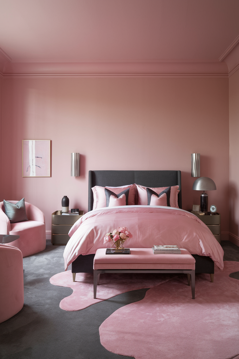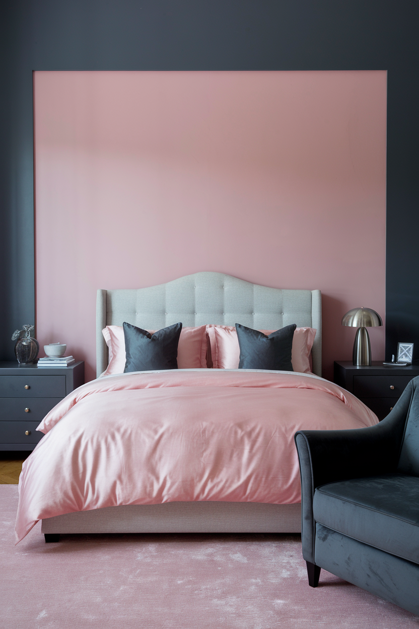 For a more sophisticated and dramatic pink bedroom, pair soft pink with charcoal gray. While pink brings warmth and softness, charcoal gray adds depth and a touch of edginess to the design. Start with soft pink accents like a duvet cover, throw pillows, or an accent wall, and balance this with charcoal gray furniture such as a bed frame, nightstands, or a cozy armchair. The contrast between the softness of pink and the boldness of charcoal gray creates a striking, balanced look. Add metallic or glass accessories, such as a mirrored nightstand or silver light fixtures, to further enhance the drama and luxury of the space.