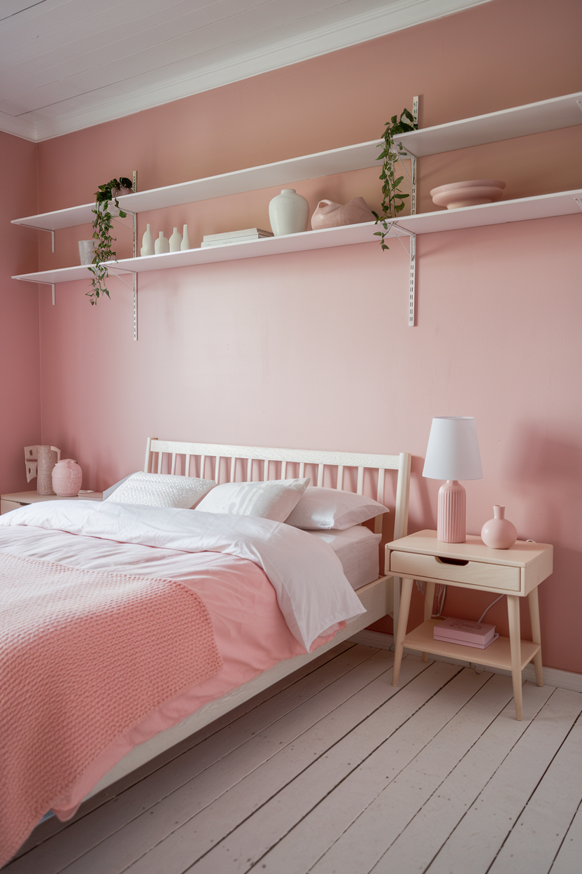 If you’re drawn to contemporary designs but love the warmth of pink, try combining peachy pink tones with modern furniture. Peachy pink walls provide a subtle yet warm backdrop, allowing modern pieces to take center stage. A sleek, low-profile bed frame, minimalist nightstands, and clean-lined furniture will complement the soft pink. Consider incorporating metallic elements, such as a brass lamp or chrome bed frame, to add sophistication and a modern edge to the space. To bring it all together, add a statement chandelier or some abstract wall art to infuse the room with style and personality.