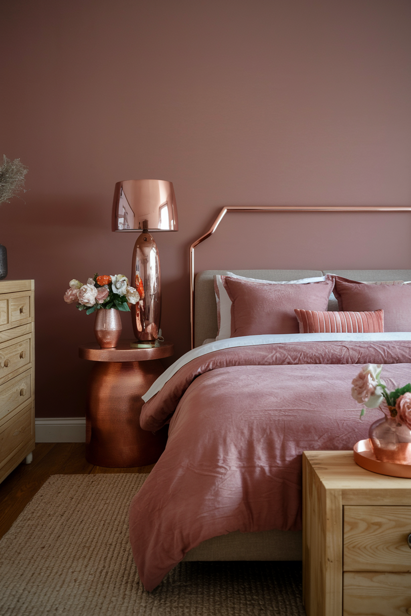 Dusty rose is a muted, elegant shade of pink that pairs beautifully with warm copper accents. Consider painting your walls in dusty rose or using it in your bedding or drapery, and then complement this color with copper lighting fixtures, vases, and picture frames. Copper’s warm, metallic finish creates a refined contrast against the soft rose, adding a touch of sophistication to your bedroom. Incorporate natural materials like wood for furniture and woven textiles for a grounded, cozy vibe. The combination of dusty rose and copper creates a sophisticated atmosphere perfect for a chic and cozy bedroom.