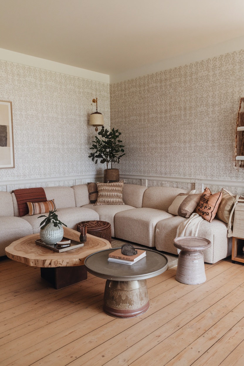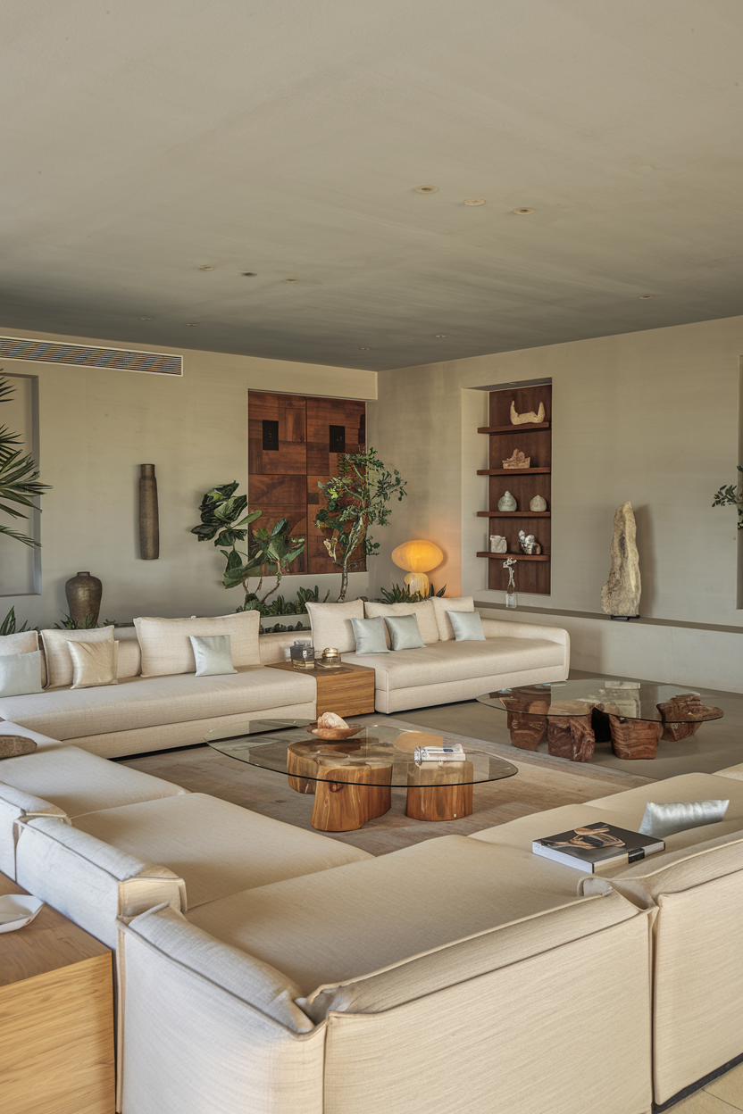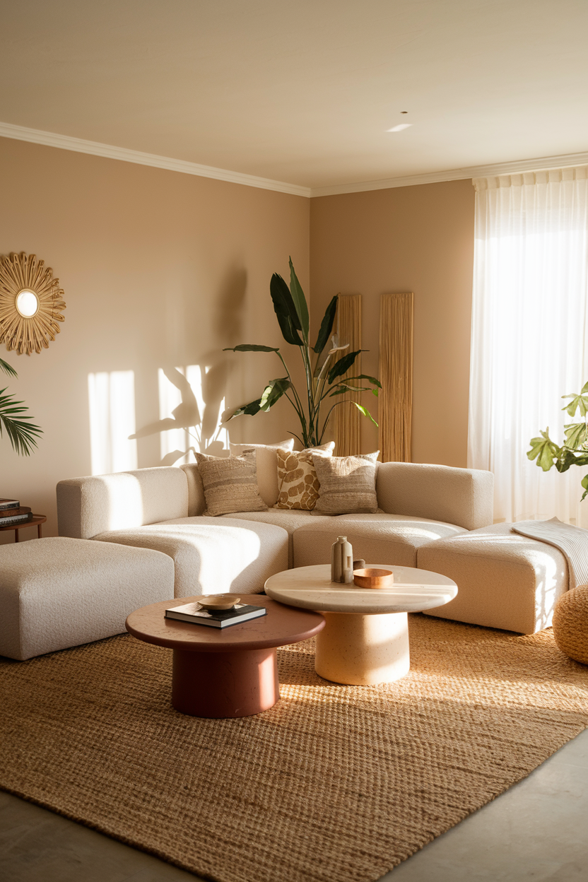 Natural materials like wood, stone, and wicker bring a rustic, earthy feel to your sun-drenched living room. Light woods such as oak, ash, or birch complement the natural light and add warmth to the space. Wooden furniture pieces, woven baskets, and stone accents like sculptures or coasters introduce texture and visual interest while maintaining the airy vibe of the room. These materials connect the space to nature, enhancing the sense of calm and tranquility.