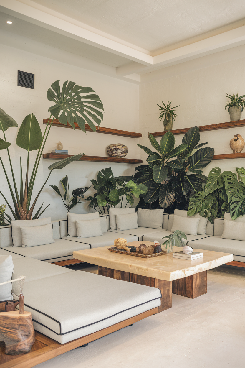 Vertical gardens are an excellent way to bring nature indoors while utilizing wall space. A vertical garden allows you to introduce lush greenery into your living room without taking up valuable floor space. Hanging plants on the wall or installing a living plant wall can fill your space with vibrant shades of green that complement natural sunlight. The presence of greenery in a sun-drenched room enhances the atmosphere, promoting relaxation while giving the room a fresh, organic feel. Plus, the plants absorb the sun’s rays, helping to balance the room’s energy and contribute to a calming ambiance.