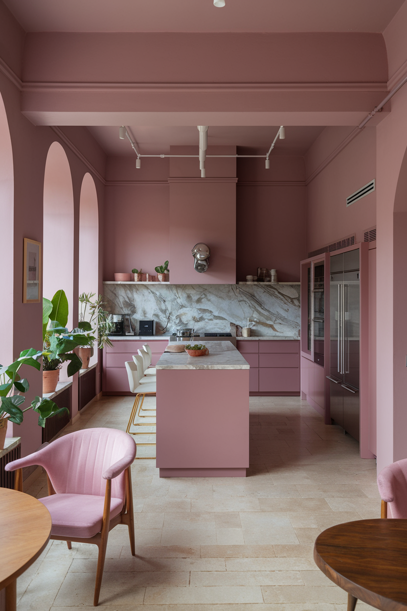The combination of pink and brass creates a luxurious, sophisticated feel in any kitchen. Brass fixtures, such as faucets, cabinet pulls, or light fixtures, pair beautifully with pink tones, adding warmth and elegance. The sheen of brass complements the softness of pink, creating a balanced and cohesive design that feels both modern and timeless. This pairing works particularly well with blush or dusty pink tones, creating a chic, polished look.