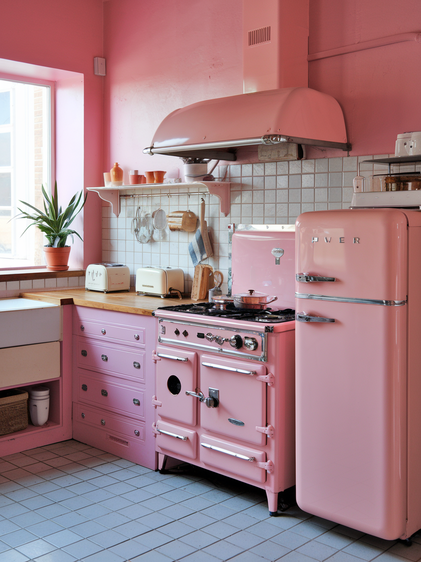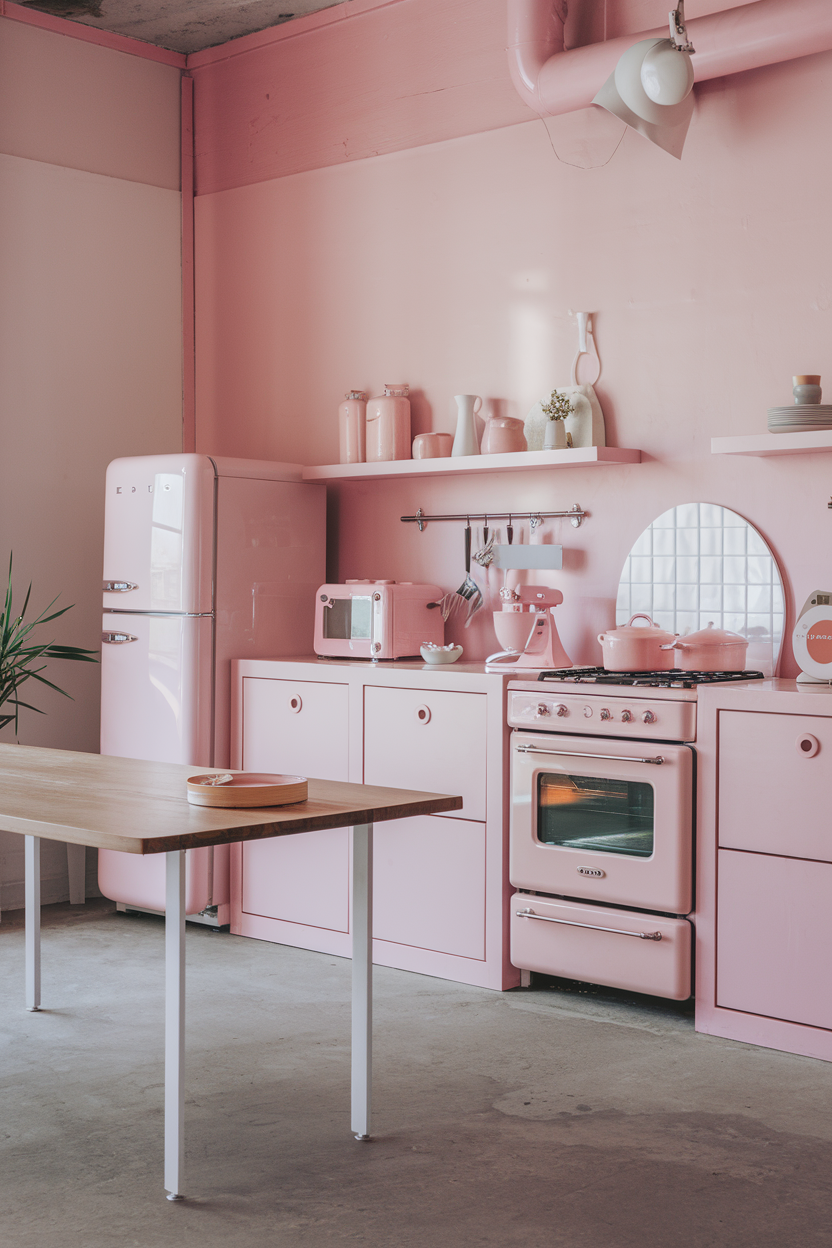 Pastel pink appliances bring a touch of vintage charm to the kitchen while keeping the space light and fun. From pink refrigerators to ovens and mixers, these appliances not only add color but also create a retro, nostalgic feel. Pastel pink works especially well in a minimalist or industrial kitchen, adding softness to balance out raw materials like stainless steel or concrete. It’s a way to incorporate pink in a less permanent manner, allowing you to switch up the color scheme if needed.
