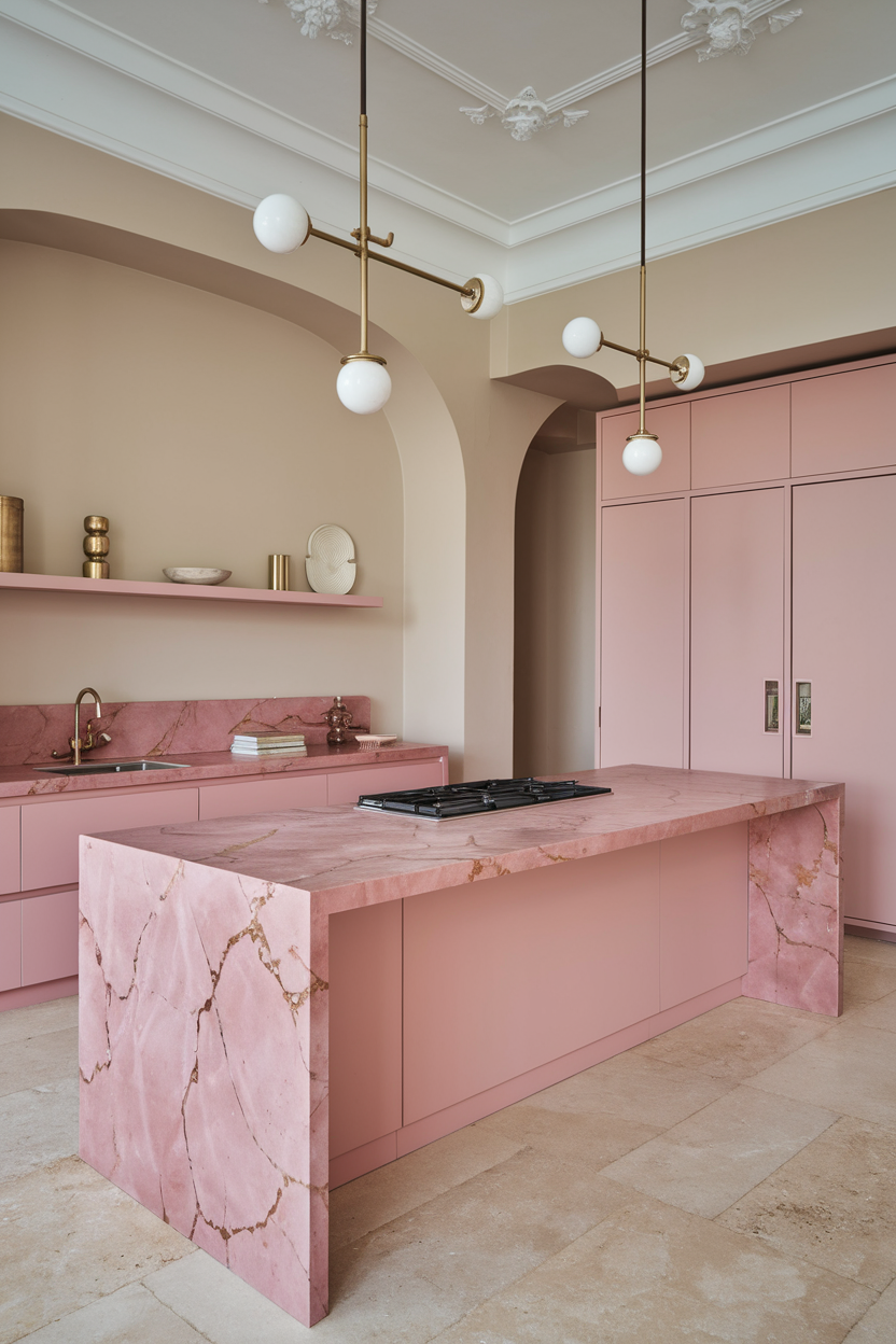 Pink marble countertops are an opulent choice that will elevate your kitchen’s design. The natural veining and luxurious texture of marble, combined with the soft pink hue, create a unique and elegant surface that stands out without being too bold. Pink marble works beautifully with brass or gold fixtures, offering a timeless and sophisticated aesthetic. It’s the perfect option for homeowners who want a high-end, luxurious kitchen with a distinctive flair.