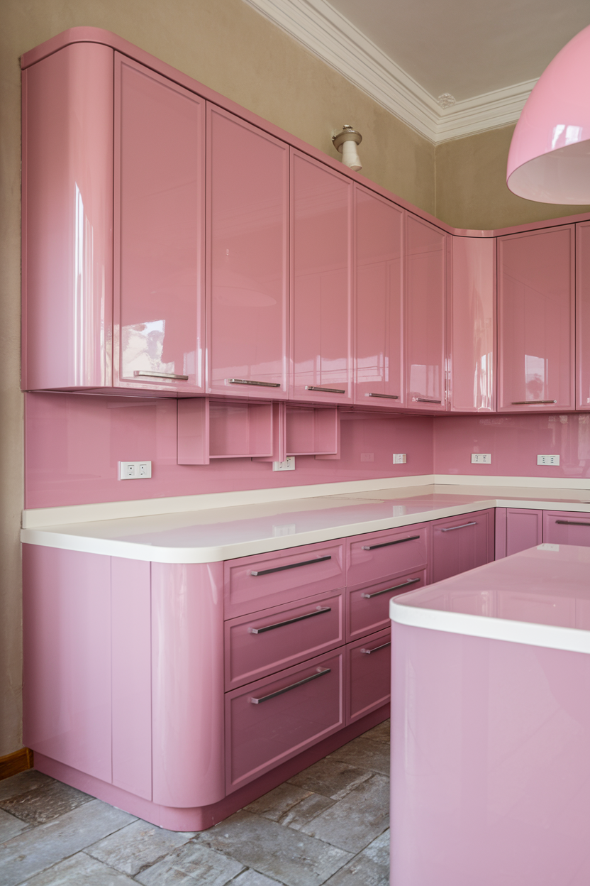 Glossy pink cabinets offer a sleek and polished look, adding depth and dimension to your kitchen. The high-shine finish reflects light, making the space feel larger and more open. Glossy pink works well with modern designs and can be paired with neutral or metallic accents to create a contemporary and chic aesthetic. This finish is also durable and easy to clean, making it both stylish and practical.