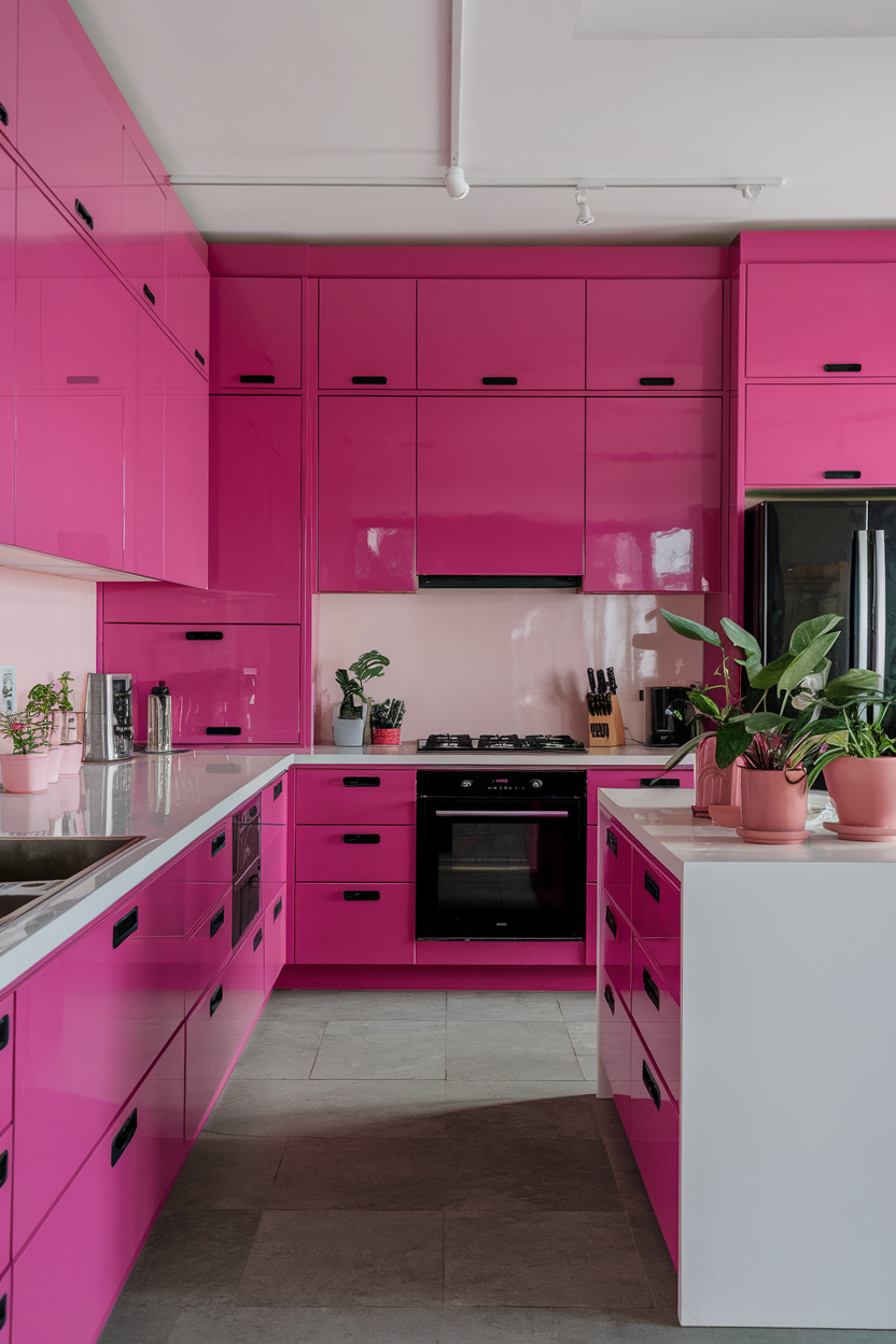 For those who love making a statement, bold pink cabinets are the way to go. Whether you choose a vibrant fuchsia or a deep rose hue, pink cabinetry brings energy and excitement to your kitchen. This daring color choice can be balanced with neutral walls and countertops or embraced with equally bold accessories. Pink cabinets can evoke a sense of playfulness and creativity while maintaining a stylish, modern edge that transforms your kitchen into a focal point of the home.