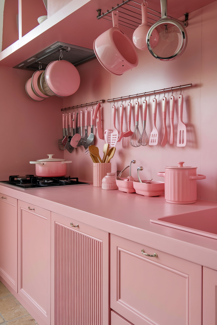 Adding pink kitchen utensils is a simple and affordable way to bring color into your space without committing to a full renovation. Think pink spatulas, whisks, or even a set of pastel pink knives. These little details can brighten up your kitchen and make cooking more fun. Display them on your countertop or hang them on hooks for easy access, adding both function and style to your kitchen design.