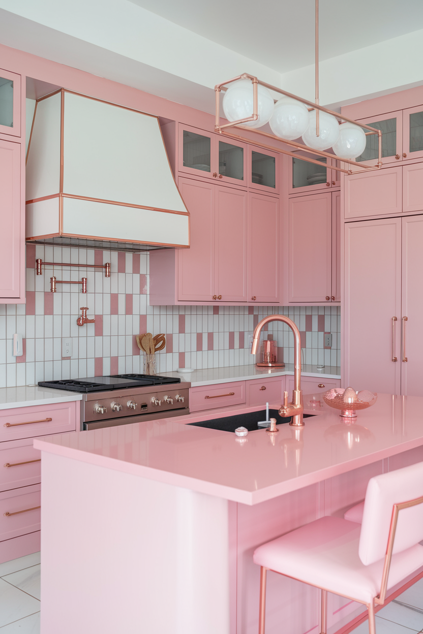 Pair pink with rose gold accents to create a luxurious and elegant kitchen. Rose gold faucets, cabinet hardware, or lighting fixtures add a warm metallic sheen that complements pink tones beautifully. This combination creates a sophisticated and glamorous feel that works well in both modern and traditional kitchens. It’s a timeless pairing that adds a touch of opulence to your cooking space.