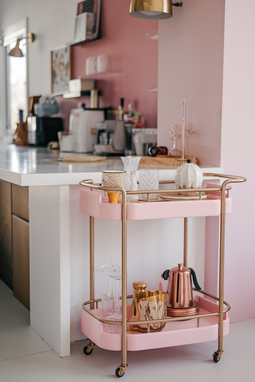 A pink and gold cart is both functional and stylish, adding a touch of glamour to your kitchen. Use it to store glassware, plates, or even kitchen essentials. The combination of pink and gold gives the cart a luxurious feel, making it the perfect accent piece for your kitchen or dining area. It’s also mobile, so you can easily move it around the house for entertaining.