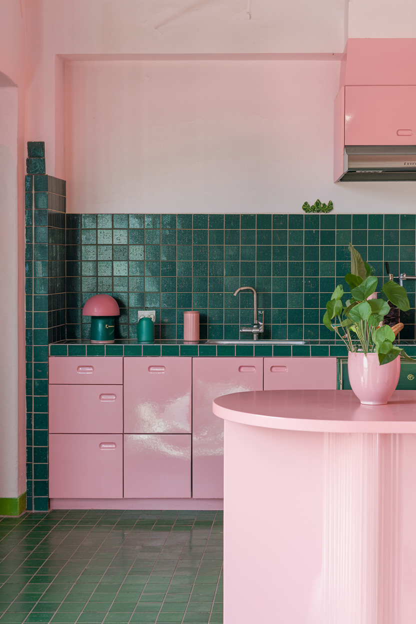 The combination of pink and green is fresh, vibrant, and on-trend. Whether it’s pink cabinets paired with green backsplash tiles or pink countertops with green accents, this pairing creates a lively, natural feel in your kitchen. The pink adds warmth while the green brings a touch of the outdoors inside, making the space feel balanced and inviting.