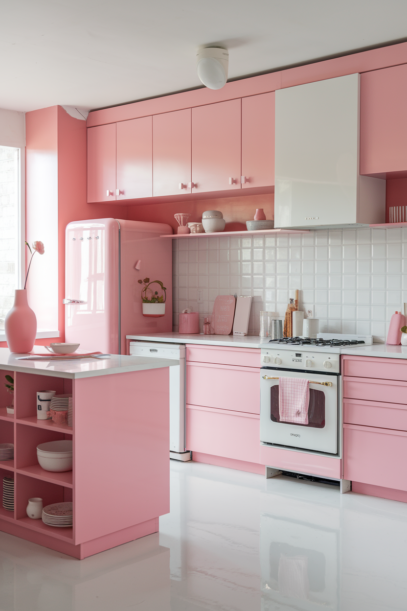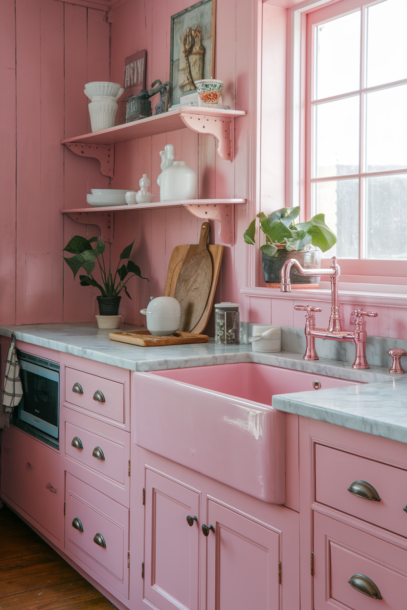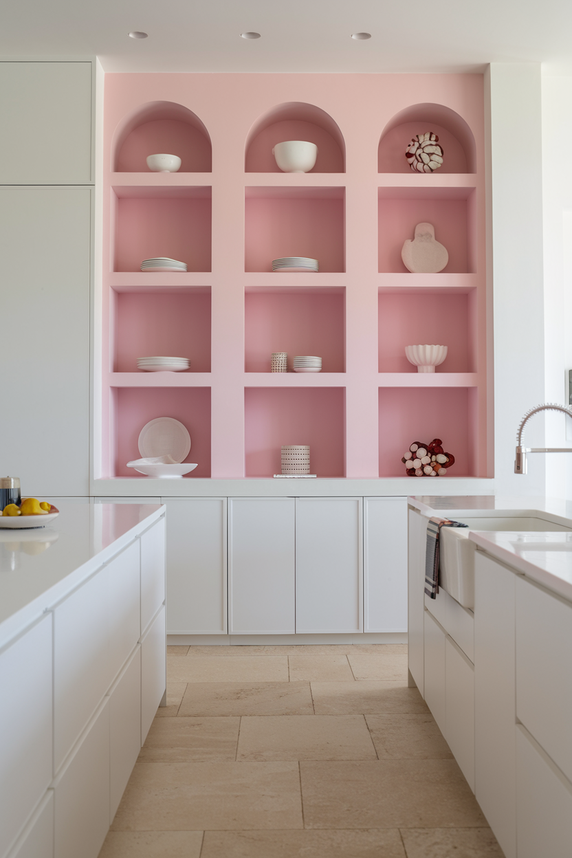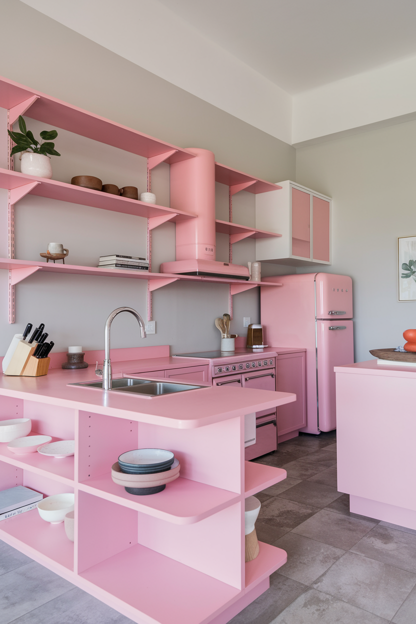 Open shelving in a pink hue is a stylish way to display your favorite kitchenware and décor. Pink shelves add a pop of color while keeping the space light and airy. This is a great option for smaller kitchens where traditional cabinetry might feel too bulky. Pink open shelving pairs beautifully with neutral walls and countertops, allowing you to showcase decorative pieces or colorful dishware while adding a personal touch to your kitchen’s design.