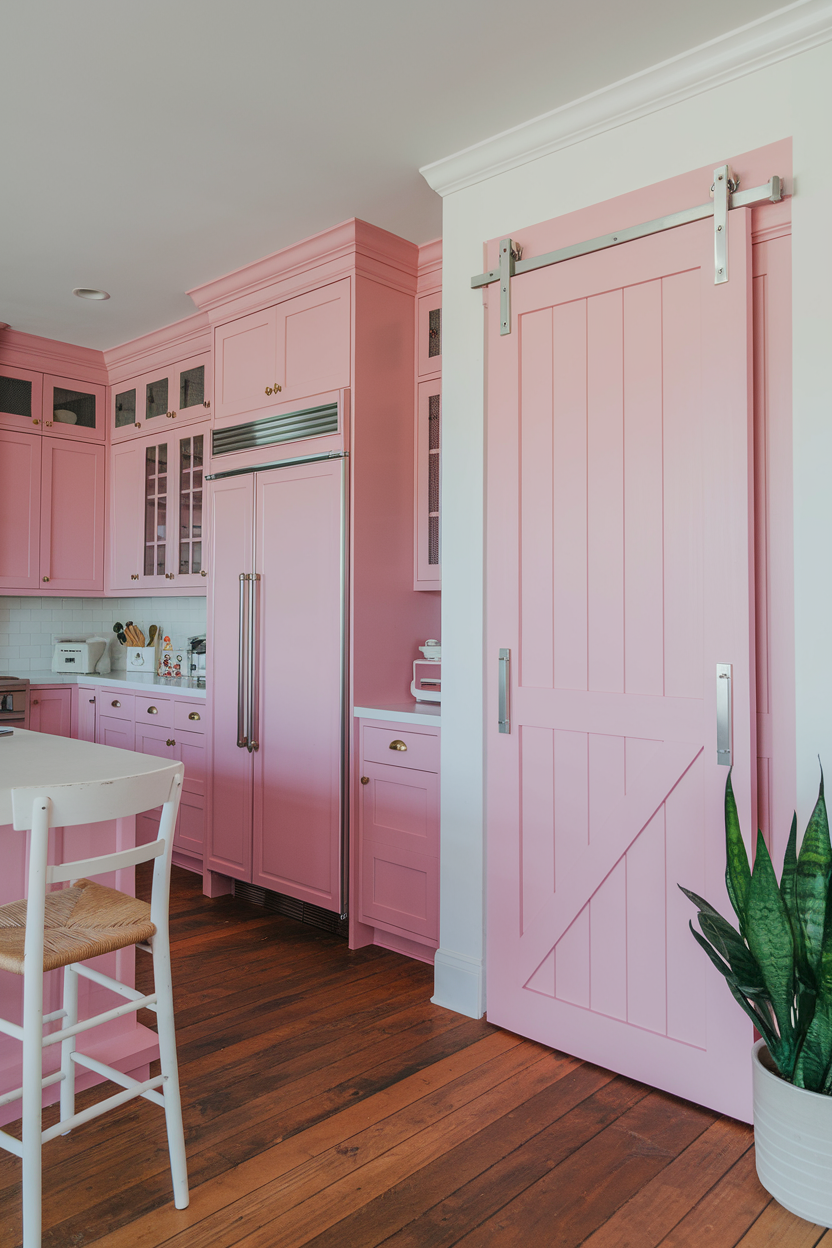 A pink pantry door adds a fun and unexpected pop of color to your kitchen. Whether it’s a barn-style sliding door or a traditional hinged door, painting your pantry door pink is a simple way to bring in some color. It’s a small detail that can make a big impact, especially if the rest of your kitchen is more neutral.