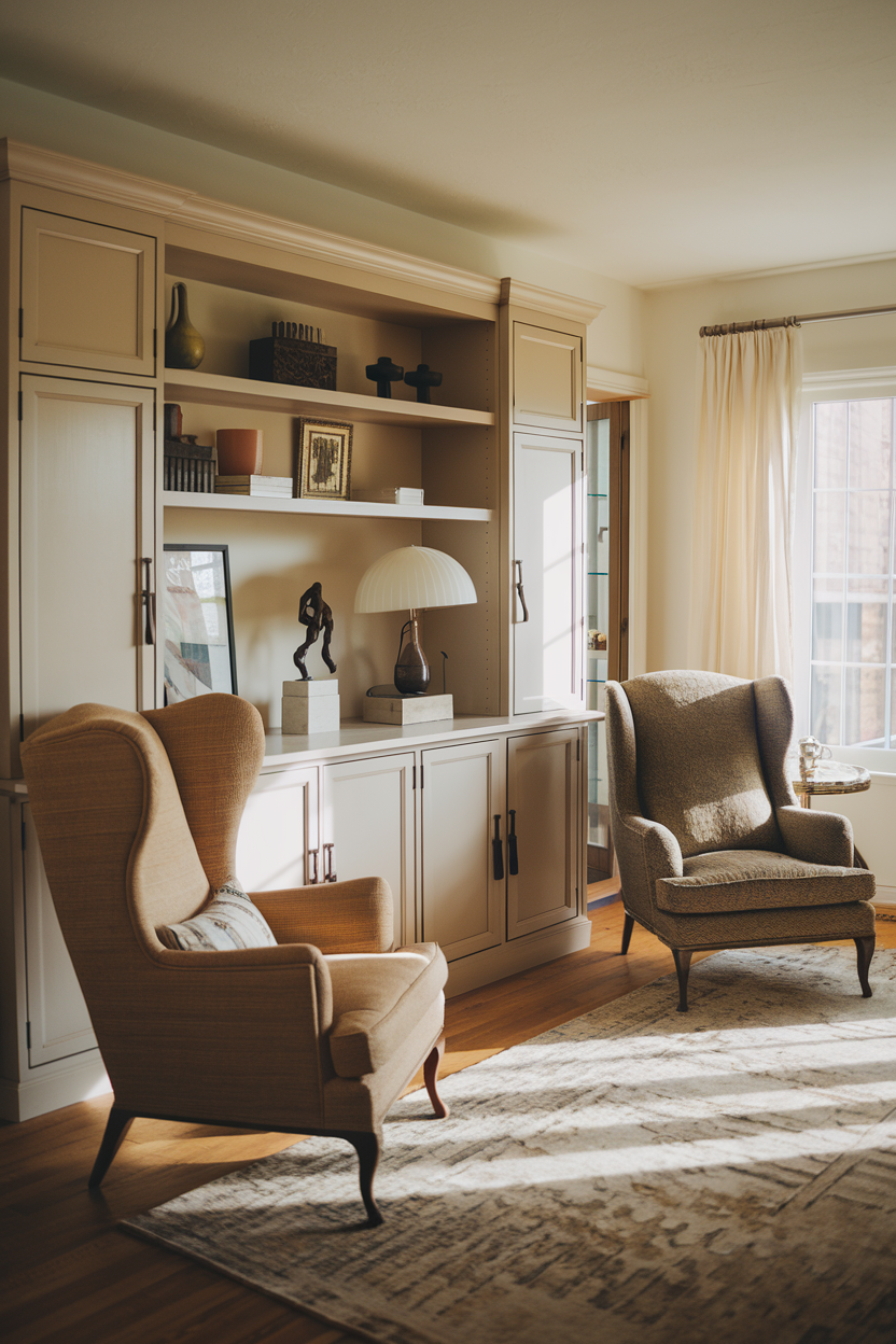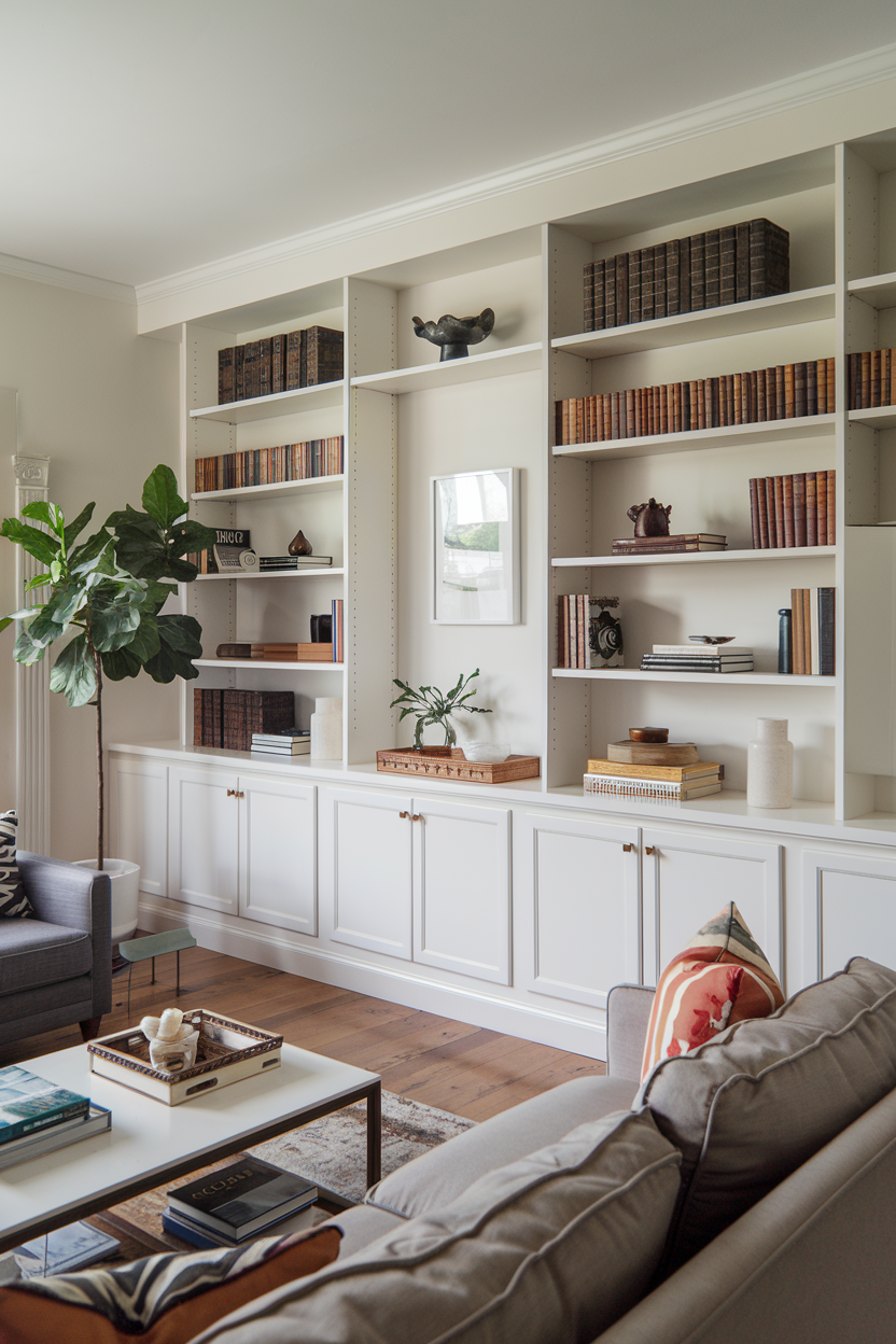 Built-in bookshelves are the epitome of functional elegance, offering both storage and display opportunities that stand the test of time. These custom installations maximize vertical space while adding architectural interest to any room. Whether flanking a fireplace in the living room or creating a cozy reading nook in a home office, built-ins provide a polished, tailored look. Styled with a mix of books, decorative objects, and personal mementos, they become a reflection of your personality. The beauty of built-in shelving lies in its adaptability – painted in crisp white for a fresh modern feel or stained in rich walnut for traditional warmth, this feature never goes out of style. For added visual interest, consider incorporating cabinet doors on lower shelves or integrated lighting to highlight your collections.