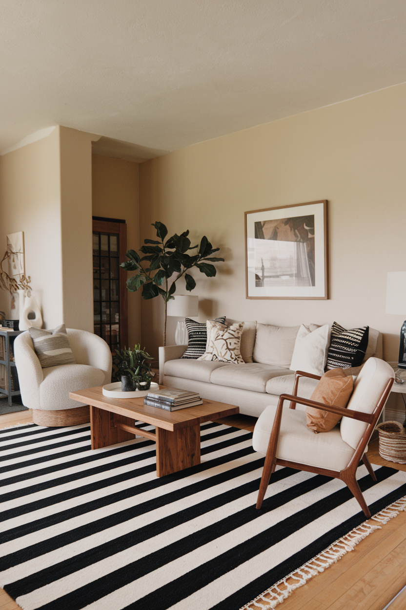 Bold yet elegant, black and white stripes are a timeless design element that injects visual drama and high contrast into any space. This graphic pattern, whether narrow pinstripes or broad bands, creates a striking visual rhythm that captures attention and adds depth to a room. Stripes can be used strategically to influence the perception of space: vertical stripes can heighten a room’s ceiling, while horizontal ones can make a room feel broader. Whether incorporated through area rugs, upholstered furniture, throw pillows, bedding, or wallpaper, black and white stripes deliver a sophisticated punch that works across a variety of styles, from classic Parisian chic to modern nautical. They’re versatile enough to complement neutral decor or serve as a backdrop for bold pops of color. For a more subtle take, opt for striped curtains, a monochrome rug, or accent chairs that add dimension without overpowering the overall aesthetic.