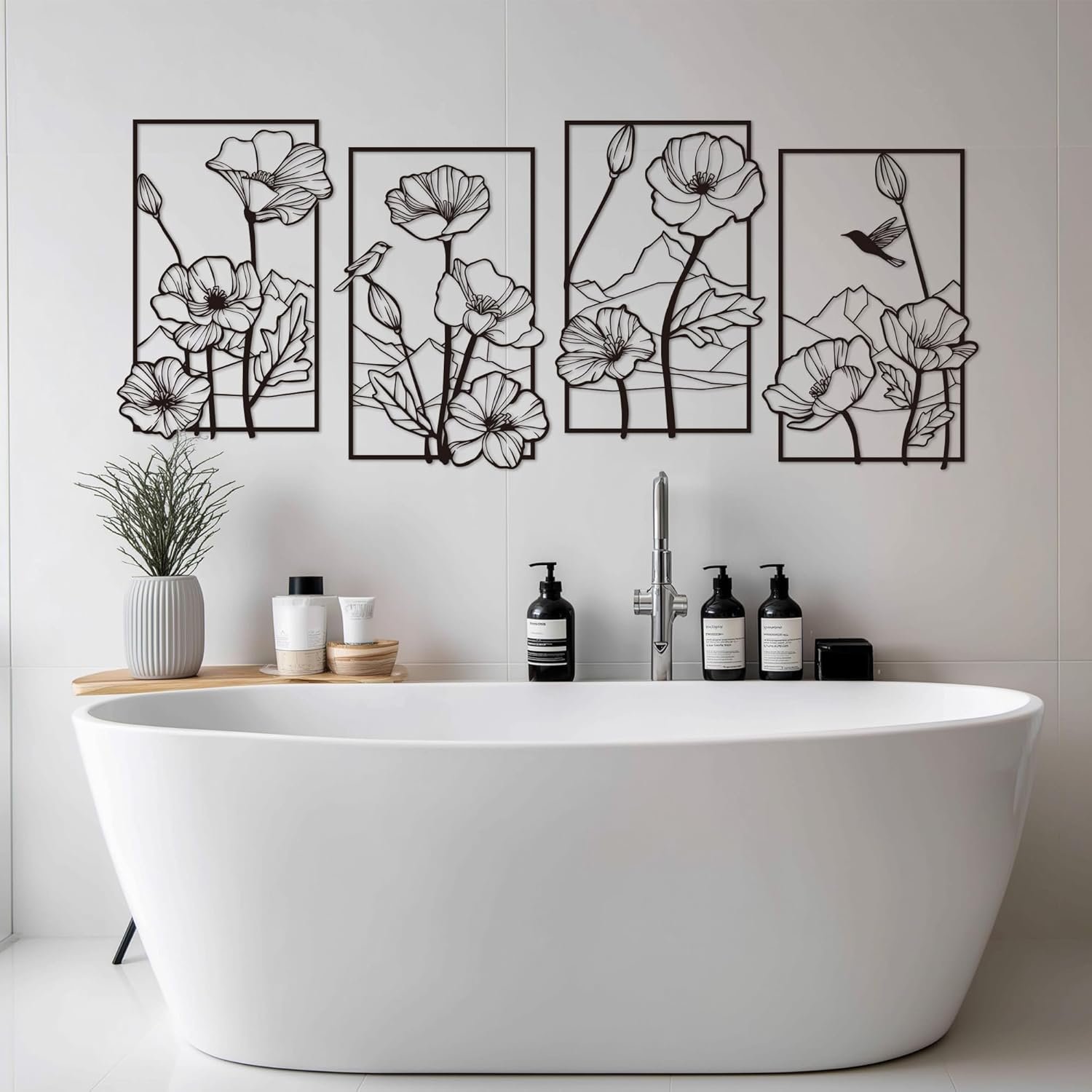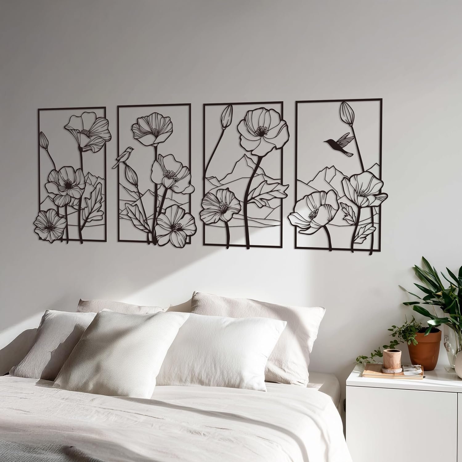 This metal wall art set brings together the beauty of nature in a striking modern composition. Featuring poppy flowers, mountain landscapes, and birds framed in bold black outlines, the design creates a dynamic visual story that feels both artistic and calming. The fusion of multiple natural elements adds depth and character, making the artwork stand out as a refined focal point on any wall.