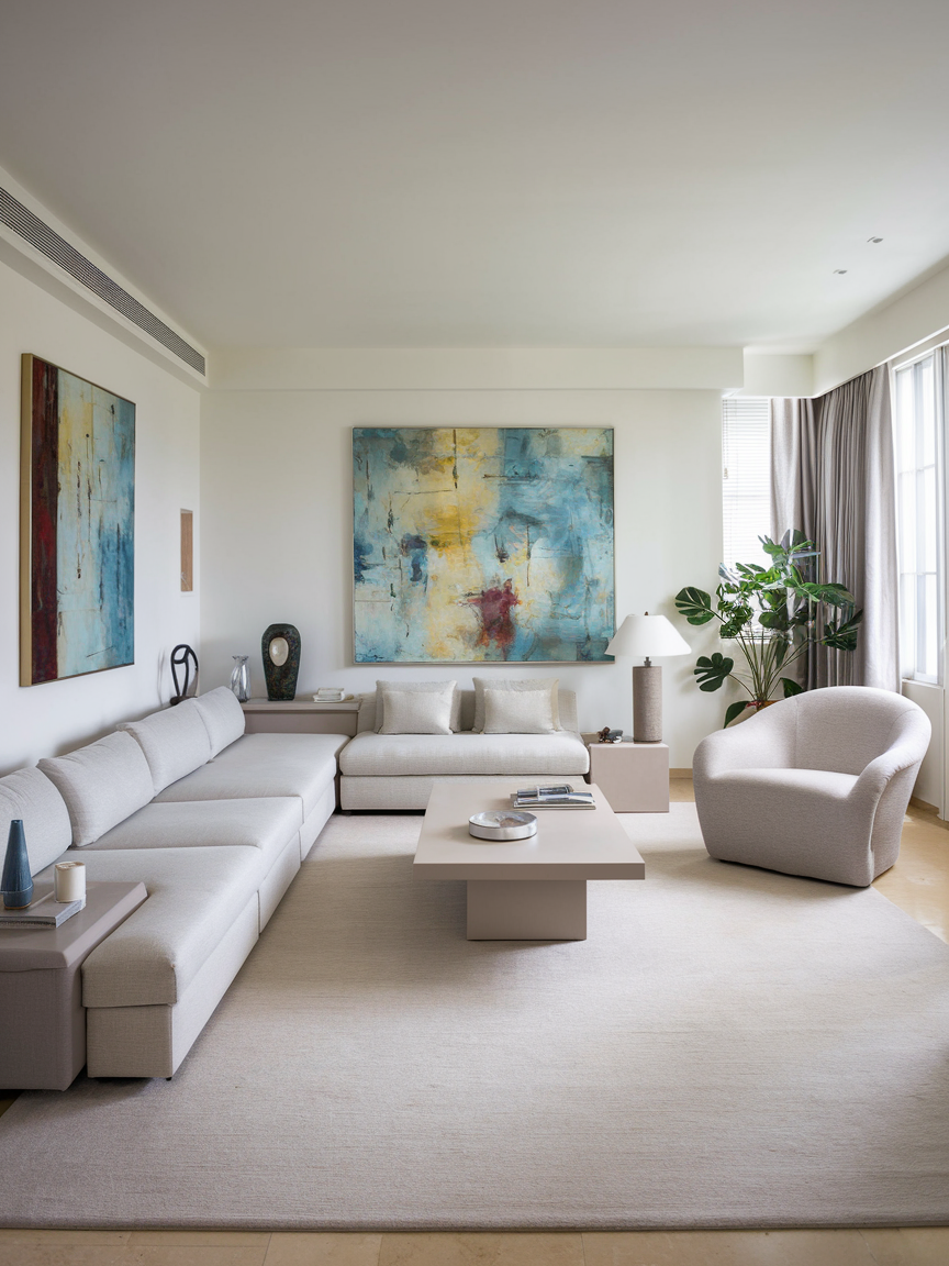 Keep surfaces clutter-free, and only display what you truly love. A minimalist living room might feature a white sectional sofa, a simple oak coffee table, and one piece of wall art that sets the tone. Built-in storage and multipurpose furniture are perfect allies in this style.