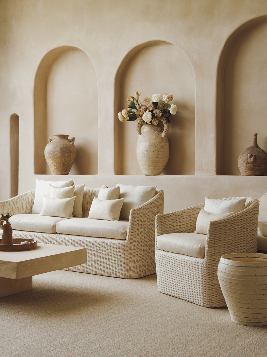 - Rattan, wicker, and driftwood.