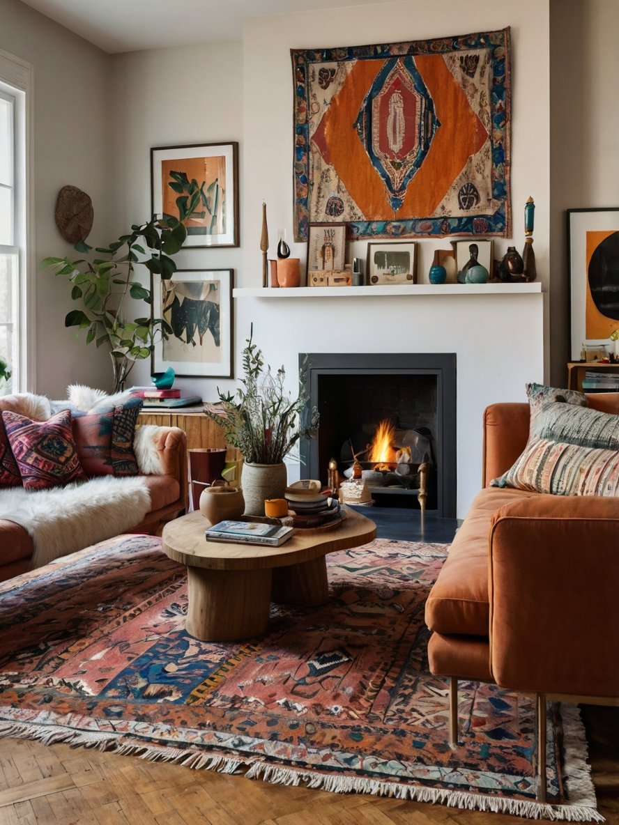 Mix and match rugs, pillows, and throws in different textures. Incorporate global-inspired décor such as Moroccan lanterns or Indian tapestries. Plants are a must—hanging, potted, or oversized palms all add to the lush, lived-in vibe.