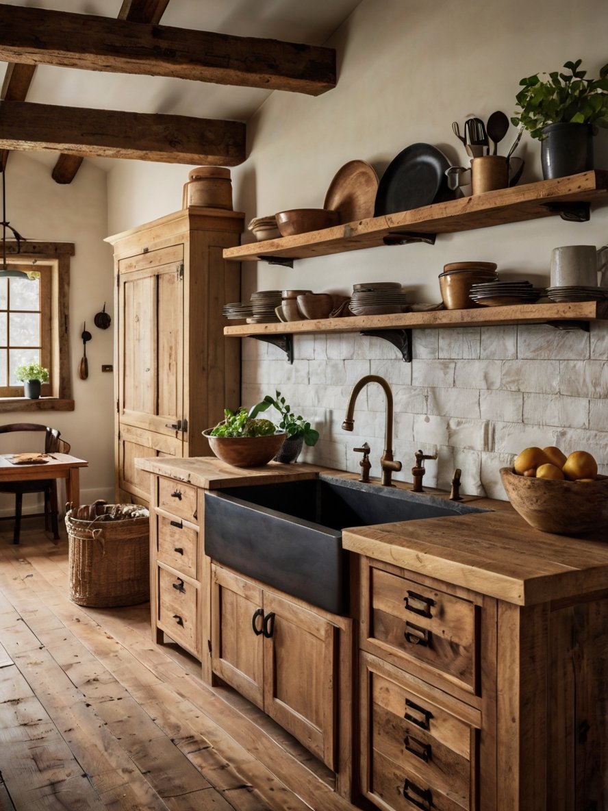 Incorporate open shelving in the kitchen, apron-front sinks, and oversized dining tables. Add rustic charm with distressed finishes and handmade décor.