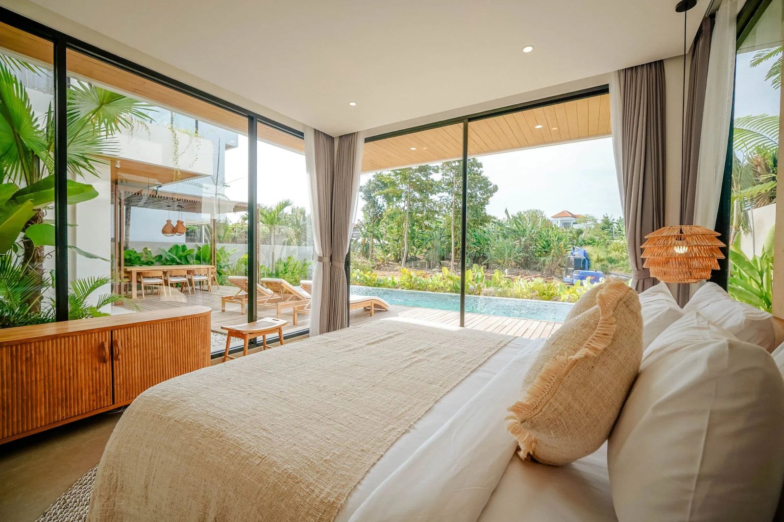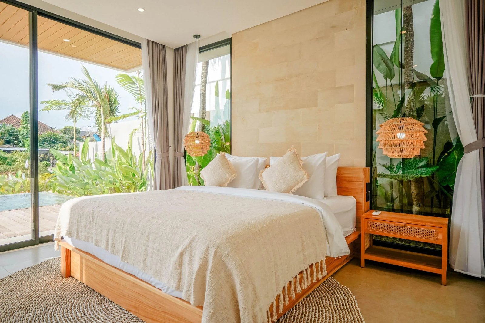 This bedroom beautifully merges indoor comfort with outdoor serenity. The expansive floor-to-ceiling glass doors allow an abundance of natural light to pour in, creating a seamless connection between the interior space and the lush greenery outside. The neutral tones, highlighted by the light wooden bed frame and nightstands, evoke a calming, earthy feel. The bedding, with its soft textures and understated design, enhances the room’s tranquil vibe. The woven pendant lights introduce a touch of artisanal craftsmanship, harmonizing with the natural aesthetic. Overall, the bedroom is a peaceful oasis that blends contemporary design with a warm, organic atmosphere.