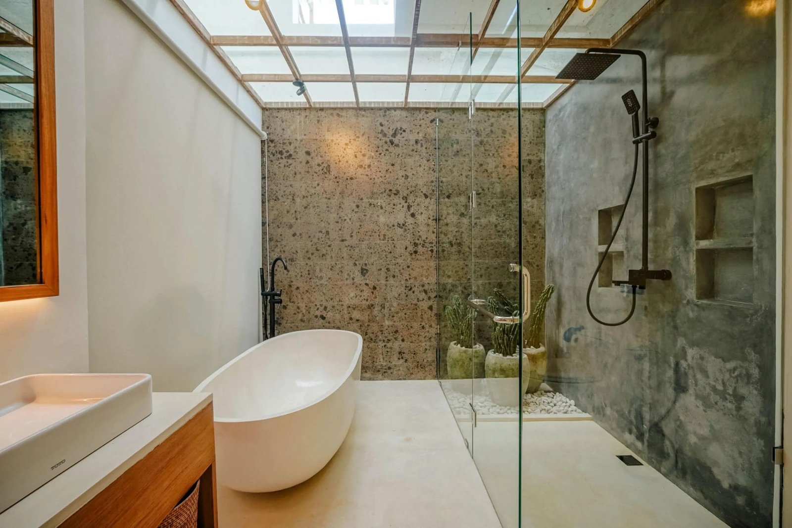 This bathroom is a perfect blend of modern design and natural elements, creating a tranquil, spa-like atmosphere. The freestanding oval bathtub stands out with its sleek, sculptural form, inviting relaxation. The walk-in shower, encased in glass, features a rainfall showerhead and rough-textured stone walls, adding an earthy, organic feel to the space. The large skylight overhead floods the room with natural light, enhancing the sense of openness and connection to the outdoors. Subtle touches like the minimalist vanity and the presence of greenery further elevate the calm, refreshing vibe, making this bathroom a serene and luxurious retreat.