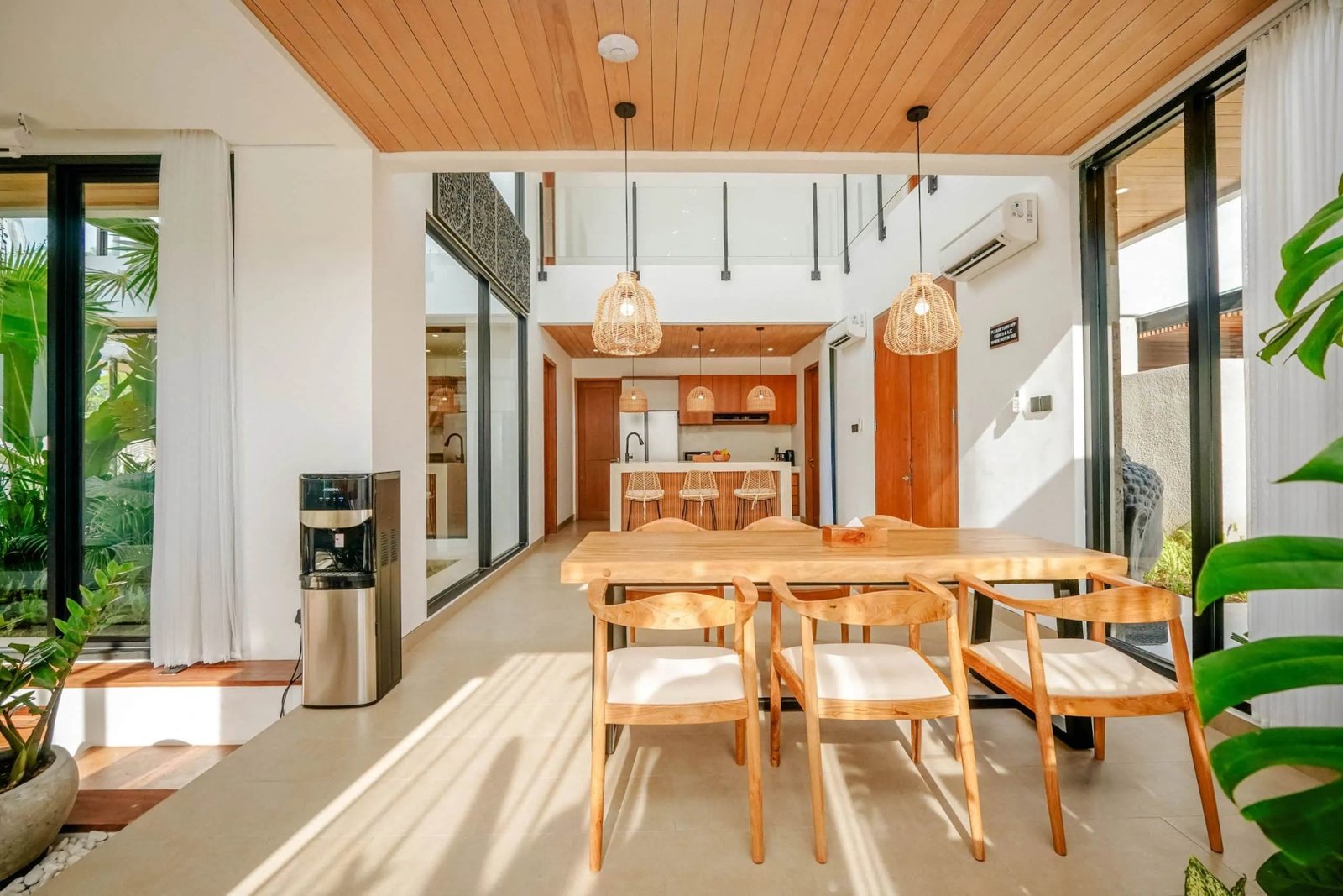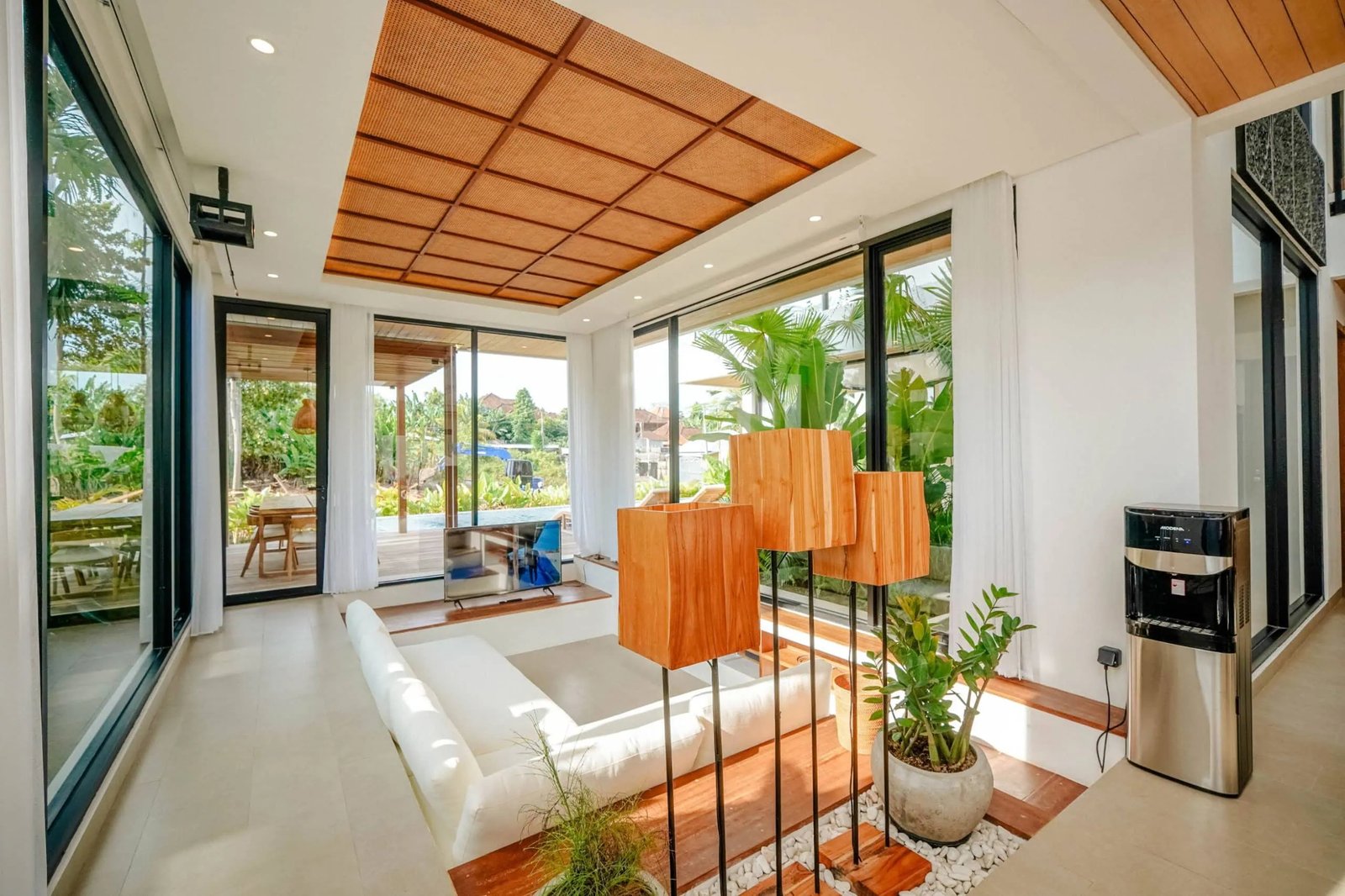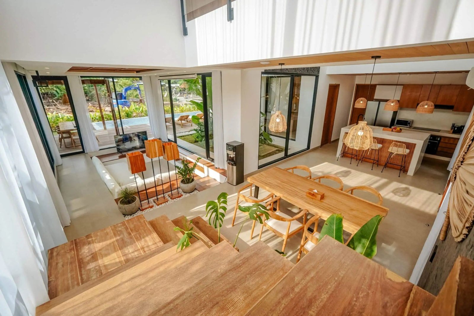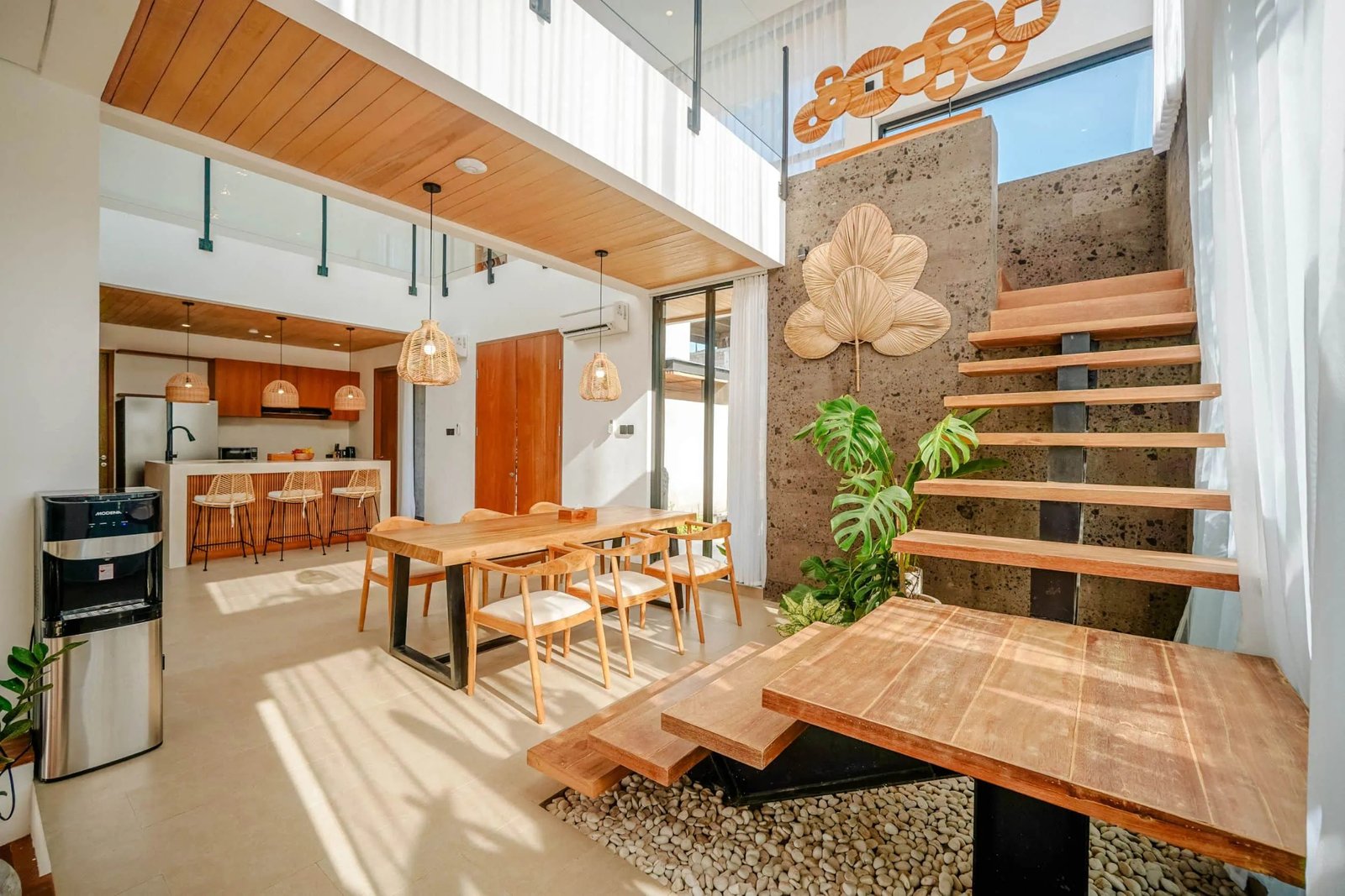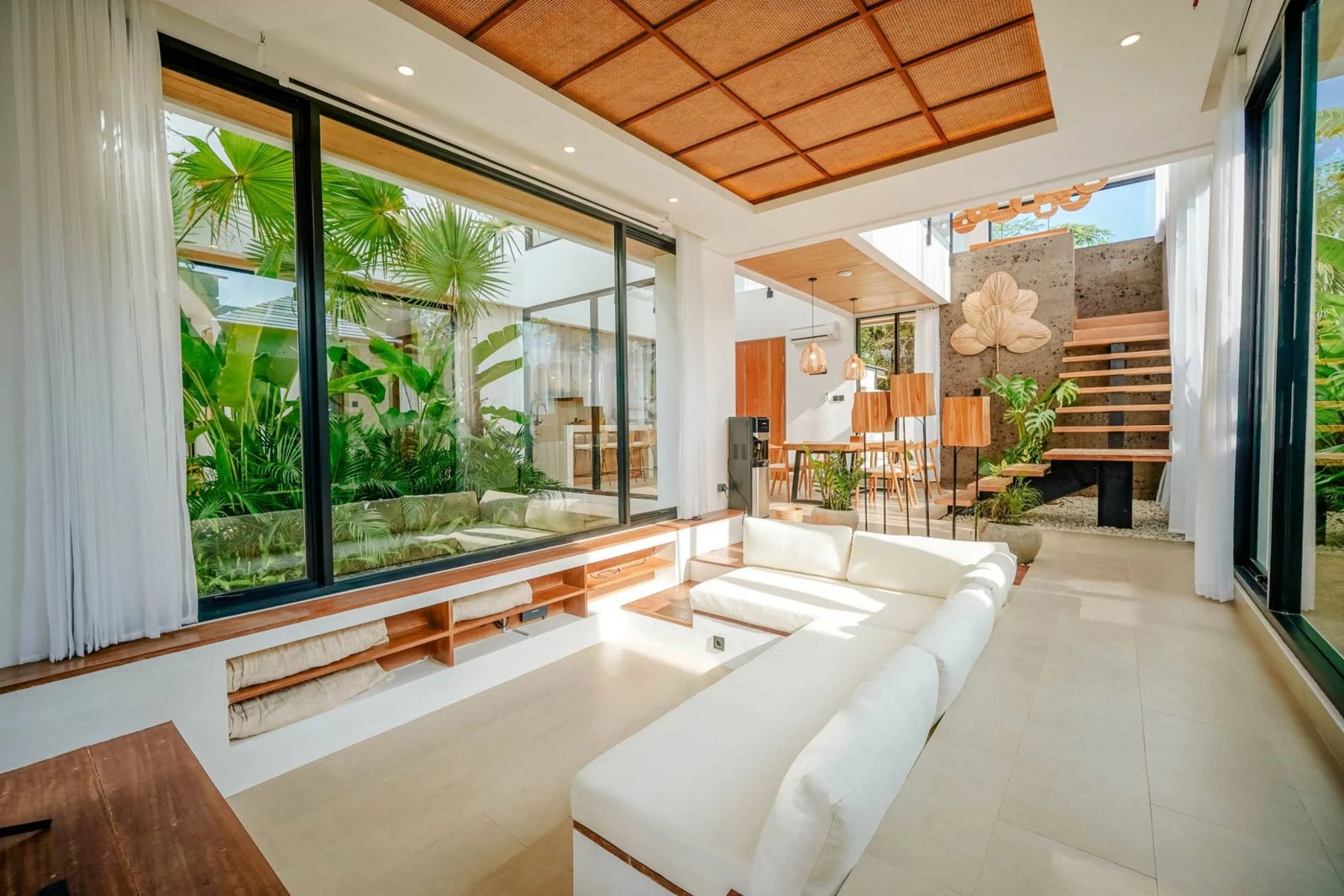This living room exudes a bright and airy atmosphere, effortlessly merging indoor and outdoor living. The large, floor-to-ceiling windows not only flood the space with natural light but also offer lush, verdant views of the surrounding tropical garden, creating a serene and calming environment. The minimalist design is complemented by natural wood accents, seen in the ceiling panels and built-in shelving, which add warmth and texture to the clean white walls and furniture. The open layout, with direct access to the dining area and an elegant floating staircase, enhances the sense of spaciousness, making this living room a perfect retreat for relaxation and entertaining.