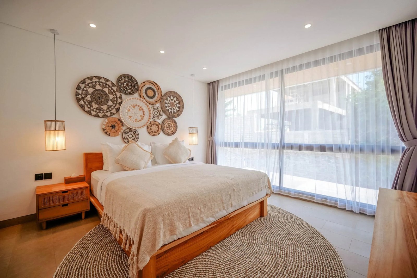 This bedroom features an expansive window that spans the entire side wall, allowing plenty of natural light. The use of double curtains not only adds a touch of luxury but also provides protection from bright sunlight. Above the headboard, a collection of woven circular ornaments with classic motifs enhances the room’s aesthetic, adding a unique and decorative charm.