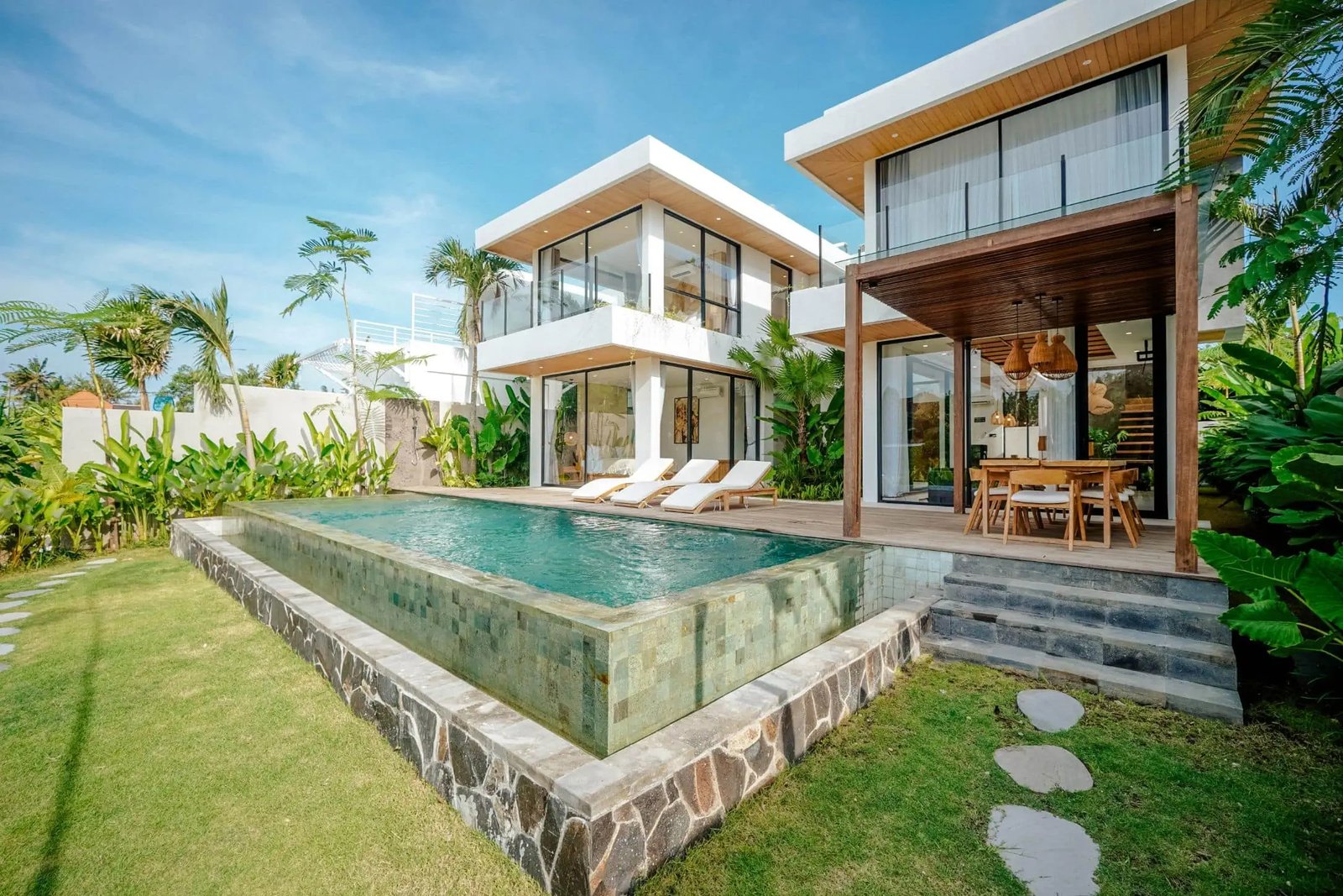 This modern villa has contemporary architecture, seamlessly blending luxury with a tropical vibe. The structure features clean lines and expansive glass windows that allow natural light to flood the interiors while offering breathtaking views of the surrounding greenery. The use of natural wood elements on the ceiling and pergola adds warmth to the otherwise sleek white facade. The infinity pool, with its green-tiled finish and stone base, creates a refreshing visual contrast and enhances the home’s resort-like ambiance. Surrounded by lush tropical plants and palm trees, this villa is a perfect sanctuary that combines elegance with the relaxed charm of a coastal retreat.
