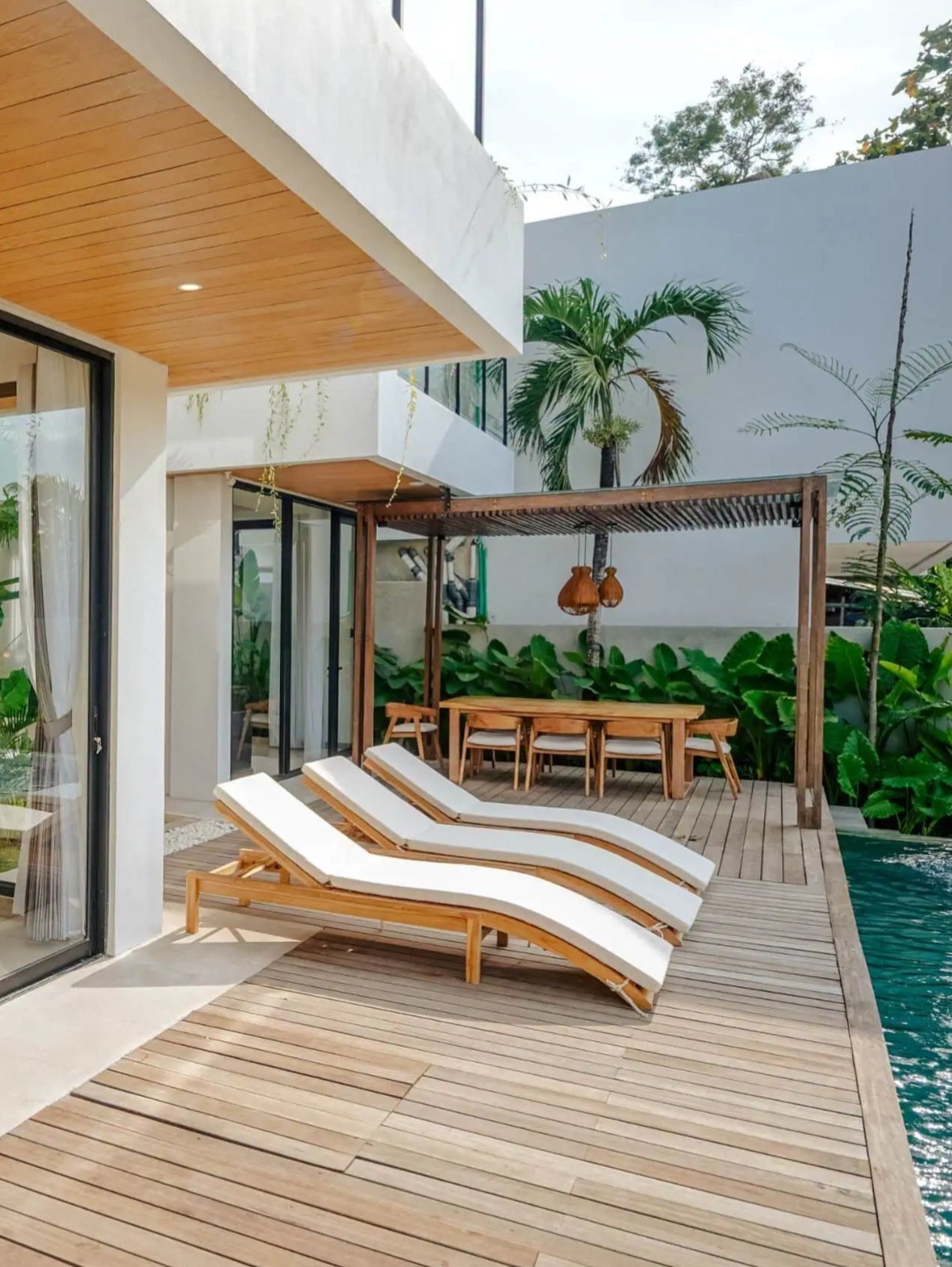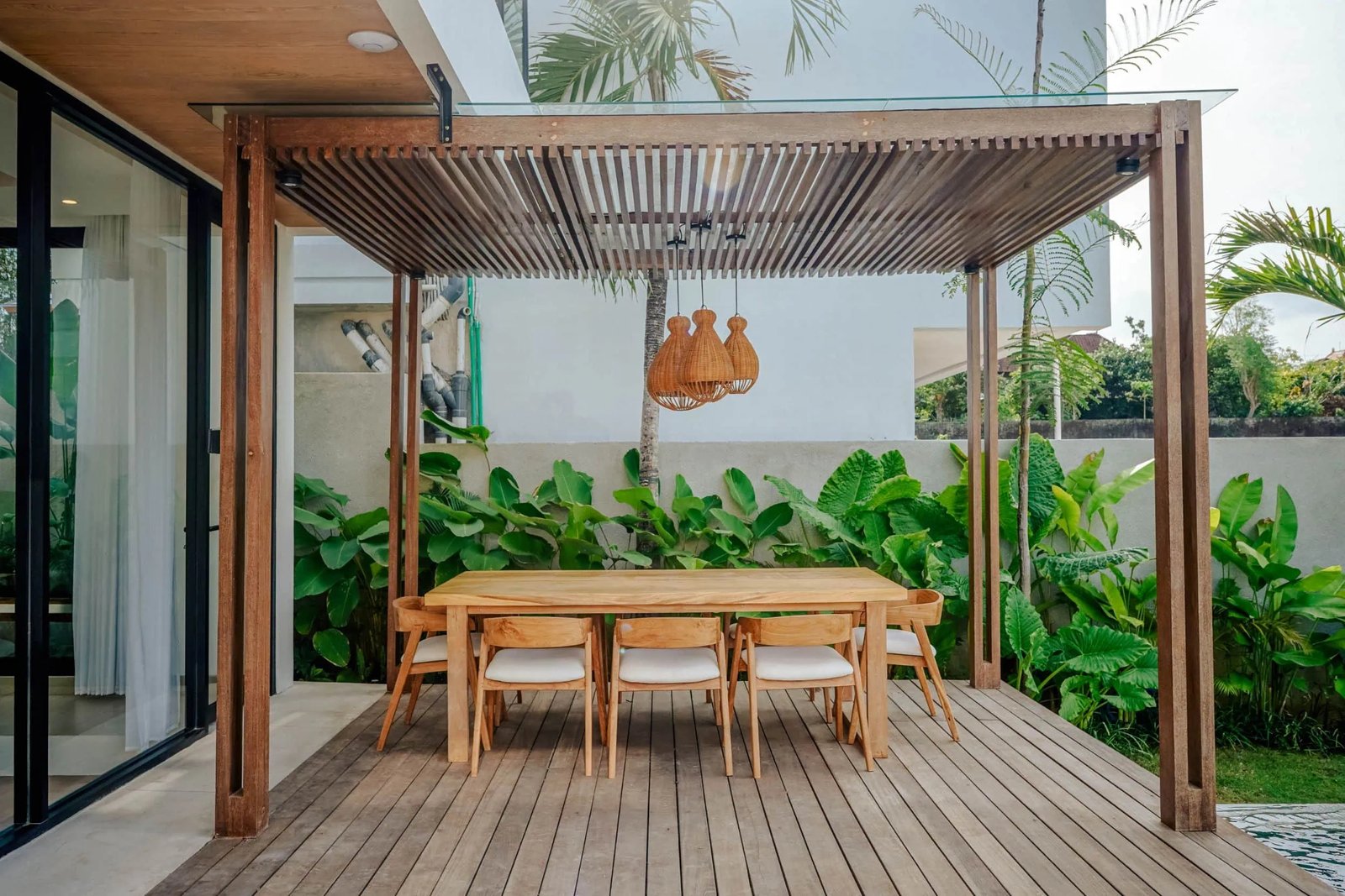 This outdoor dining area perfectly captures a serene, tropical vibe with its natural materials and lush greenery. The wooden deck and pergola create a warm, inviting space that seamlessly integrates with the surrounding environment. The slatted roof provides shade while allowing filtered sunlight to pass through, adding to the ambiance without overwhelming the space. The simple, yet elegant wooden dining table and chairs complement the overall aesthetic, making it an ideal spot for enjoying meals al fresco. The hanging wicker light fixtures add a touch of rustic charm, enhancing the cozy, laid-back atmosphere of this well-designed outdoor retreat.