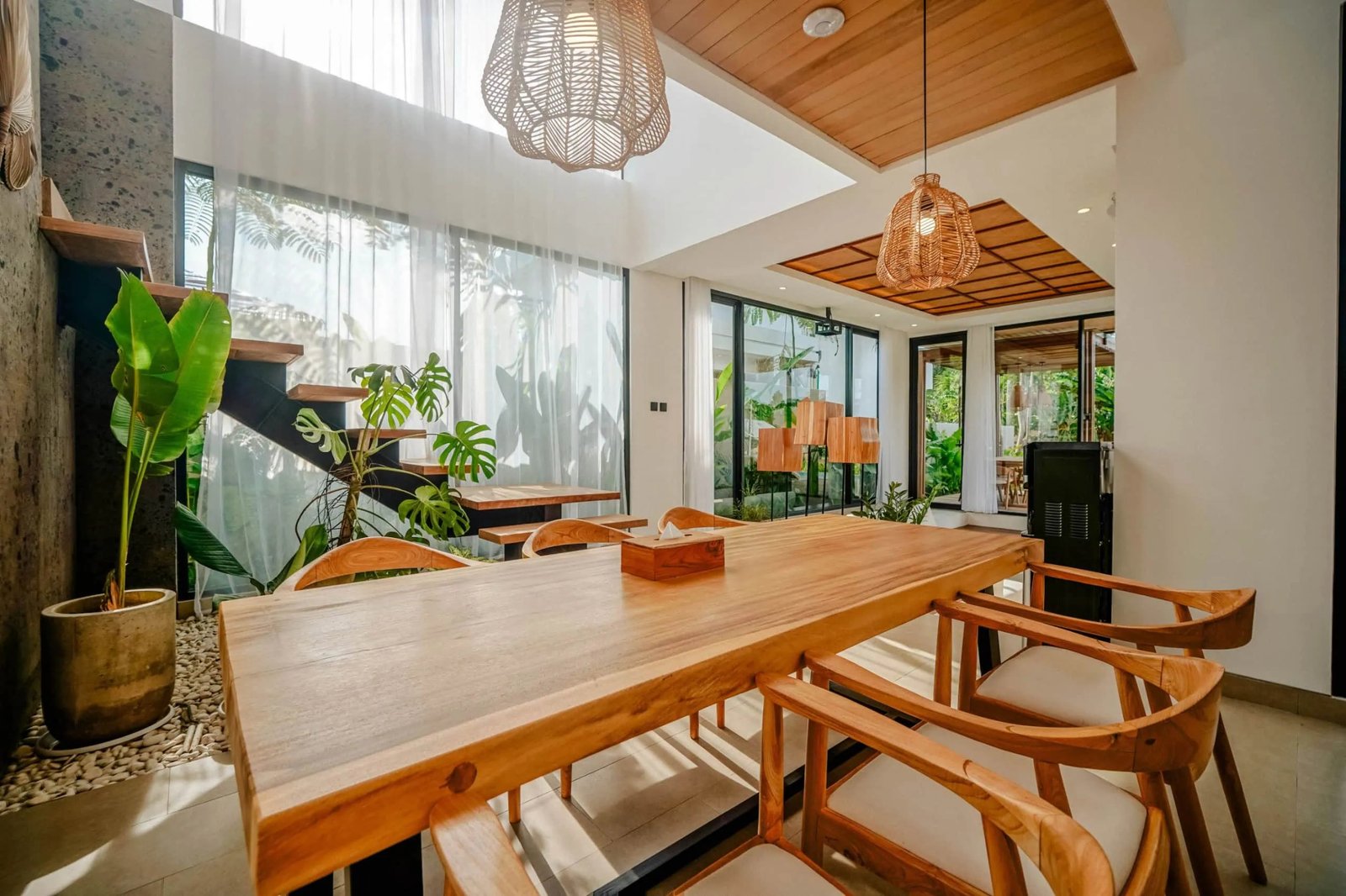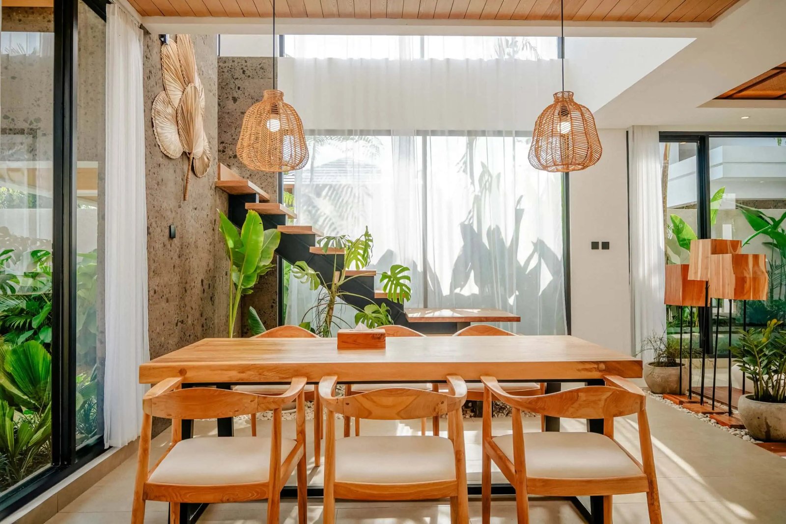 This dining area showcases a perfect blend of natural materials and modern design elements, creating an inviting and warm atmosphere. The wooden dining table and matching chairs exude a sense of rustic charm, while the woven pendant lights add a touch of organic texture and enhance the cozy ambiance. Large windows let in abundant natural light, illuminating the space and connecting it to the lush greenery outside, which adds to the tranquil and airy feel of the room. The minimalist décor, complemented by simple yet elegant details like the wall art and natural stone wall, makes this dining area an ideal space for both intimate dinners and casual gatherings.