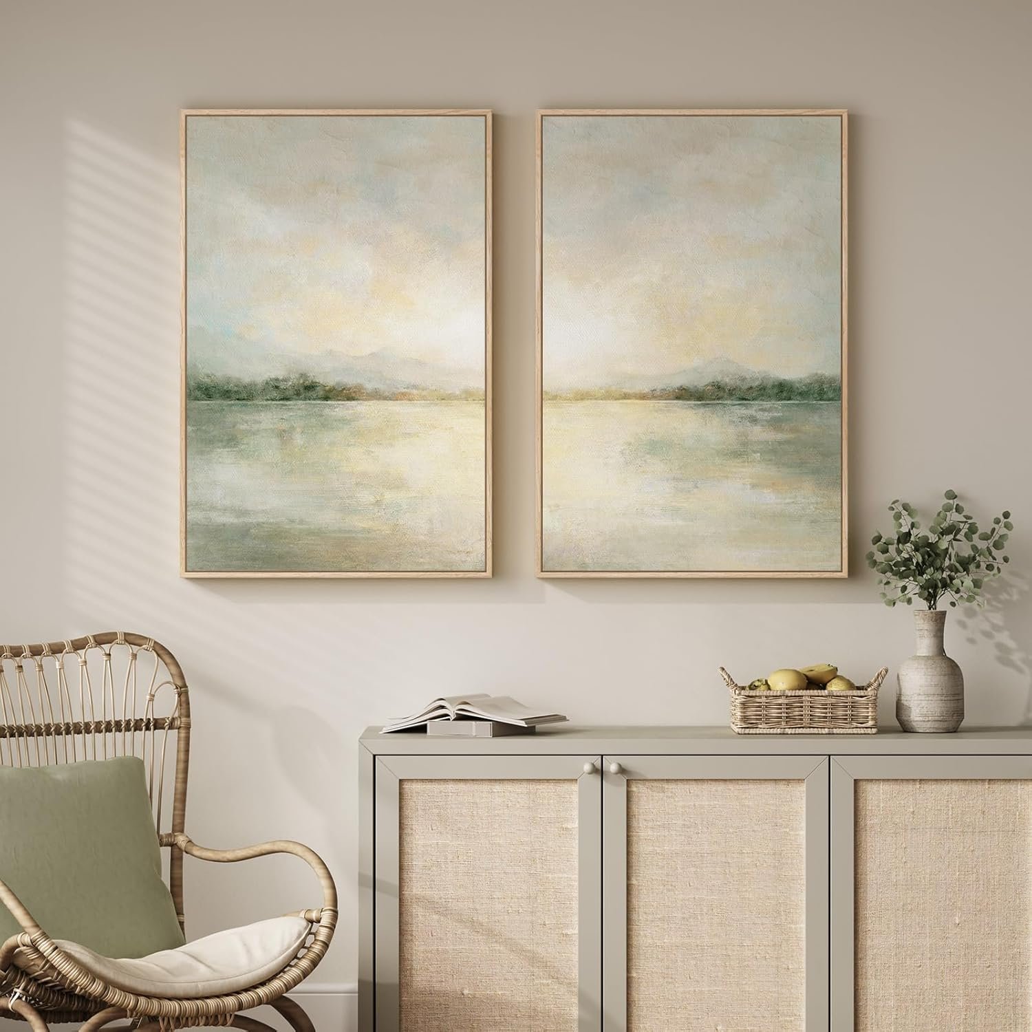 Invite a sense of calm into your home with this abstract green lake wall art set, inspired by the quiet beauty of an early morning by the water. The sage green tones evoke mist rising from a peaceful lakeshore as the landscape gently fades into a light, open sky. With each panel measuring 24 x 36 inches, the artwork offers a tall, vintage-inspired presence that adds depth and serenity without overpowering your space.
