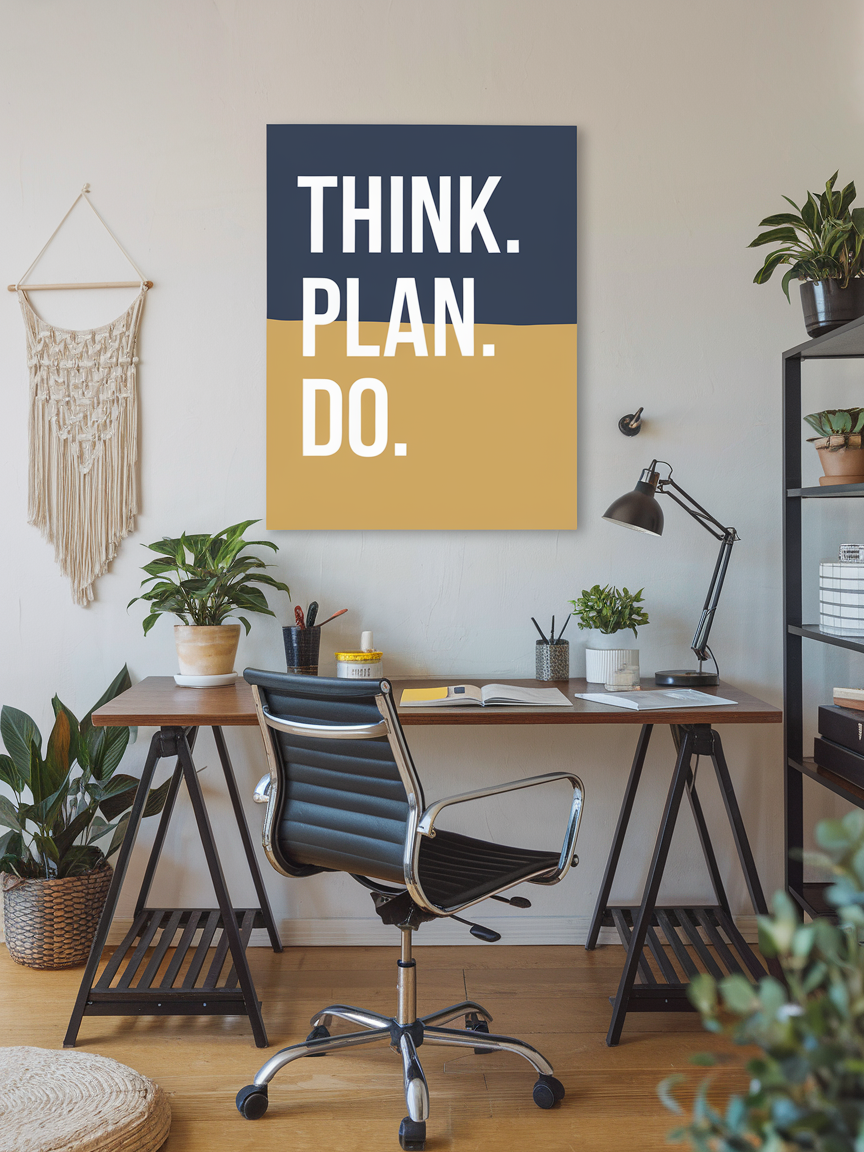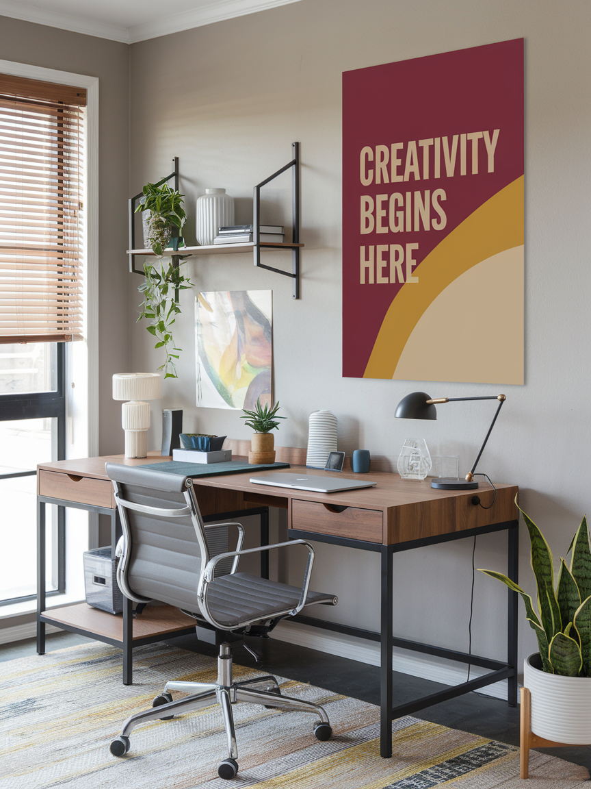 Motivational quotes in your office space can boost productivity and focus. “Think. Plan. Do.” or “Creativity Begins Here” are great examples that keep energy high while decorating your workspace.